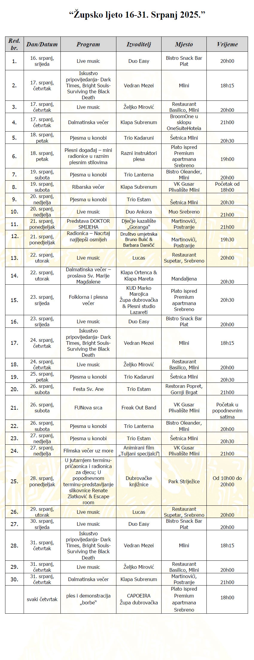 Program Župskog ljeta u drugom dijelu srpnja donosi nove koncerte klapa Subrenum, Ortenca i Mareta. Nastavlja se i program Iskustvo pripovijedanja- Dark Times, Bright Souls-Surviving the Black Death Vedrana Mezeija, u Parku Striježice održat će se pričaonica i radionica Dubrovačkih knjižnica za djecu te predstavljanje slikovnice Renate Zlatković & Escape room.