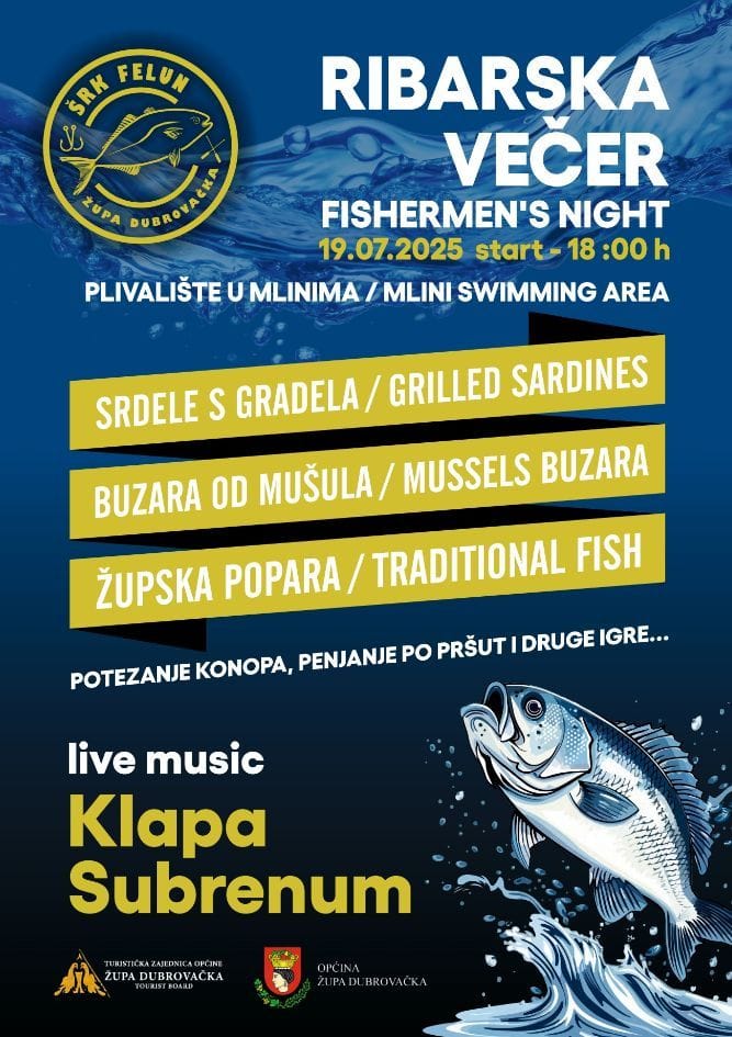 Športsko ribarski klub Felun Mlini u subotu 19. srpnja uz pomoć Turističke zajednice i Općine Župa dubrovačka ma plivalištu Gusara u Mlinima organizira Ribarsku večer uz bogatu ponudu ribljih specijaliteta od Srdela s gradela, Buzare od mušula do Župske popare. Organizirane su i tradicionalno potezanje konopa, penjanje po pršut i druge igre. Za pravi dalmatinski ugođaj pobrinut će se klapa Subrenum.
