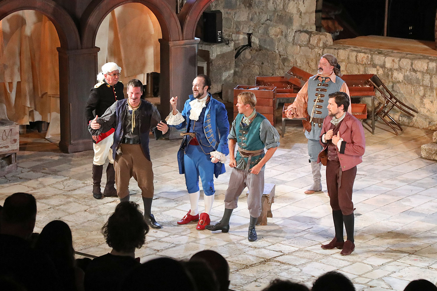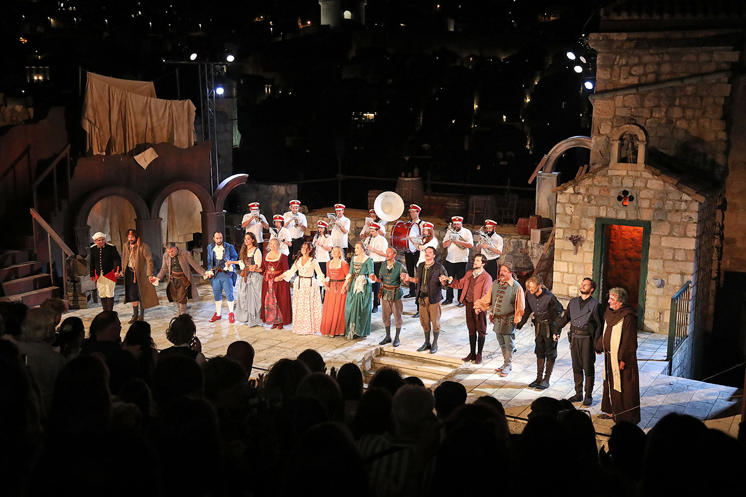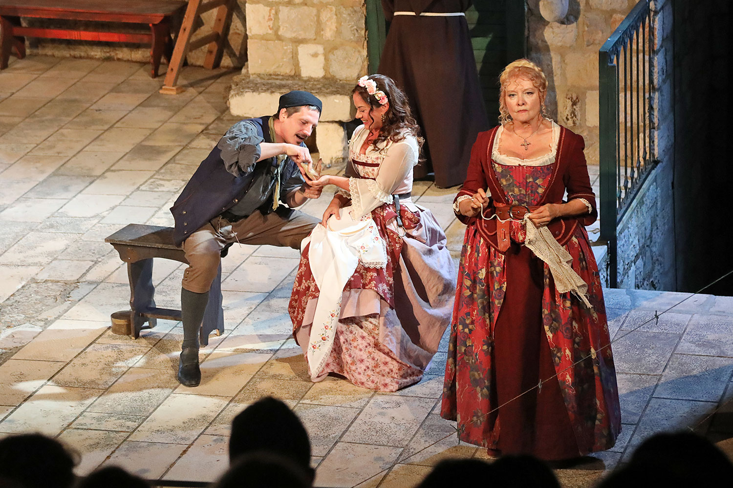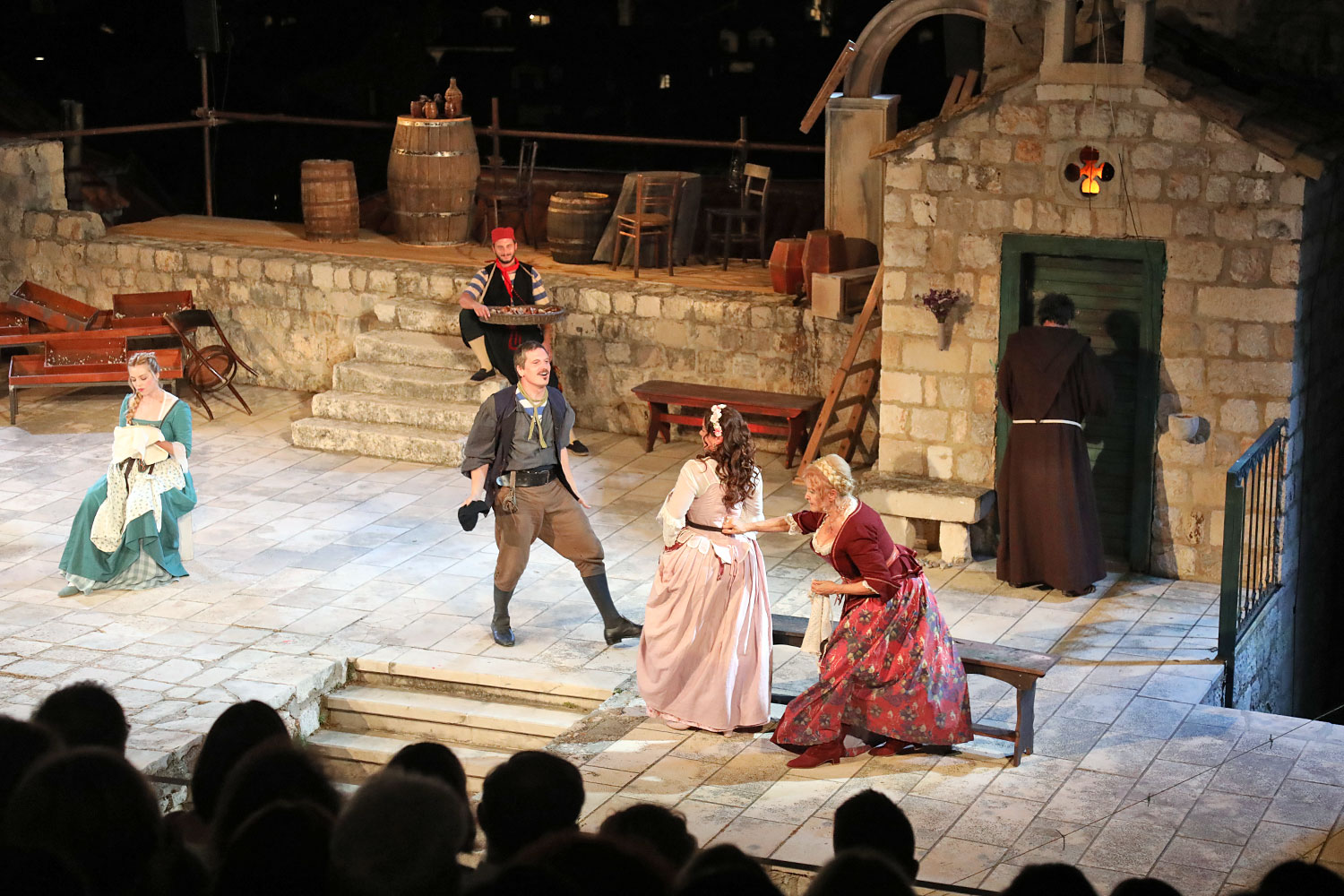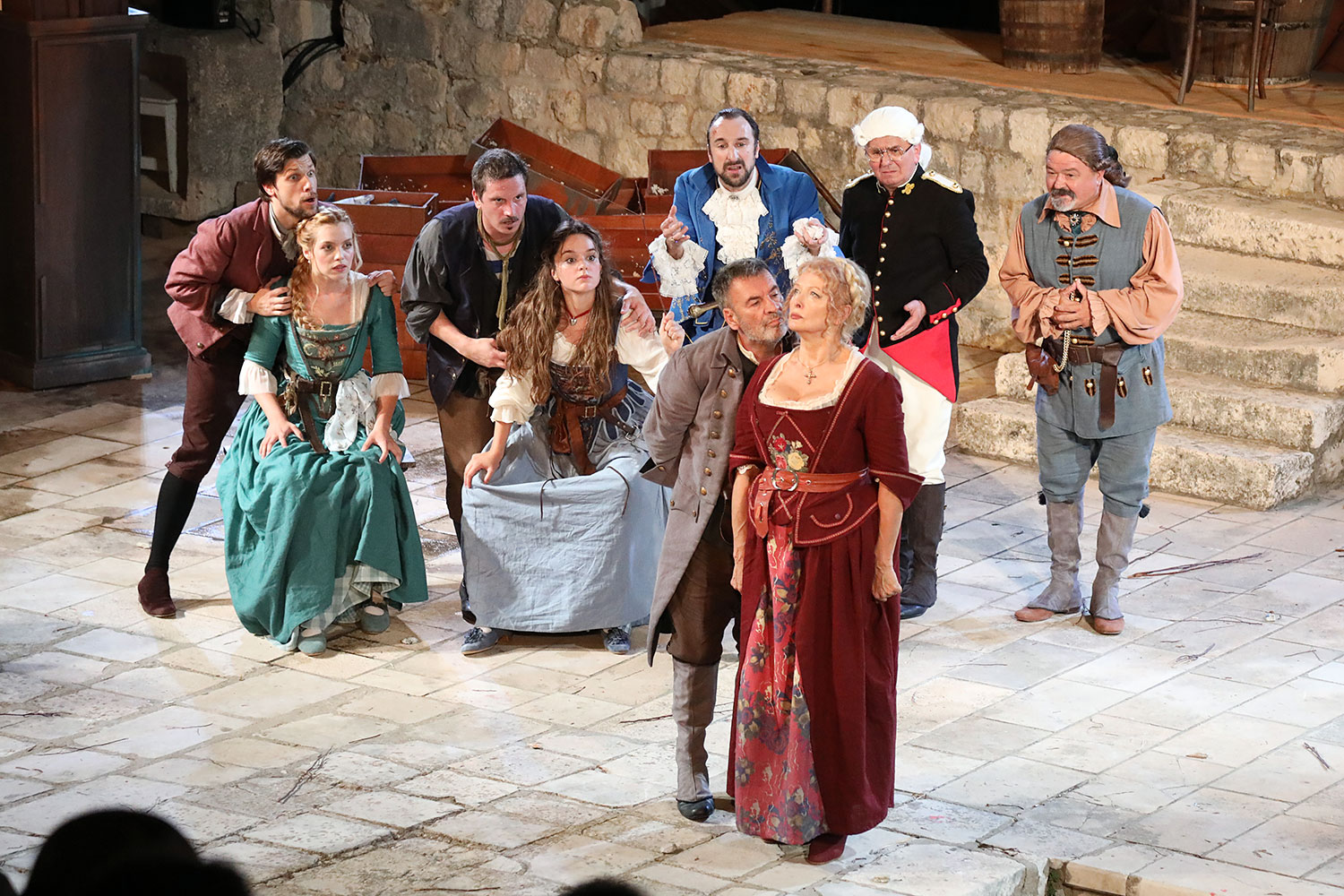 Glumačku podjelu čine: Joško Ševo (patrun Tonko, vlasnik ribarnice), Ksenija Prohaska (gospođa Pavle, žena patruna Tonka), Nika Lasić (Luce, djevojčica, sestra patruna Tonka), Bojan Beribaka (Đivo, mladi ribar), Nikola Radoš (Baldo, mladić, brat patruna Tonka), Borko Perić (patrun Nikša), Angela Bulum (gospođa Made, žena patruna Nikše), Nika Matušić (Ore, djevojčica, sestra gospođe Made), Nikolina Prkačin (Franica, druga djevojčica, sestra gospođe Made), Boris Matić (gospar Vice, ribar), Stipe Radoja (Duje, barkariol), Marijan Nejašmić Banić (Šiško, zamjenik kancelara Kaznenog suda), Branimir Vidić Flika (Zdur, glasnik kaznenog suda), Maro Drobnić (Vlaho/kanjac), Luka Bokić (Mol), Božo Petrić (Fra Božo). Svojom glazbom prvi premijerni naslov Igara su obogatili članovi Gradske glazbe Dubrovnik.