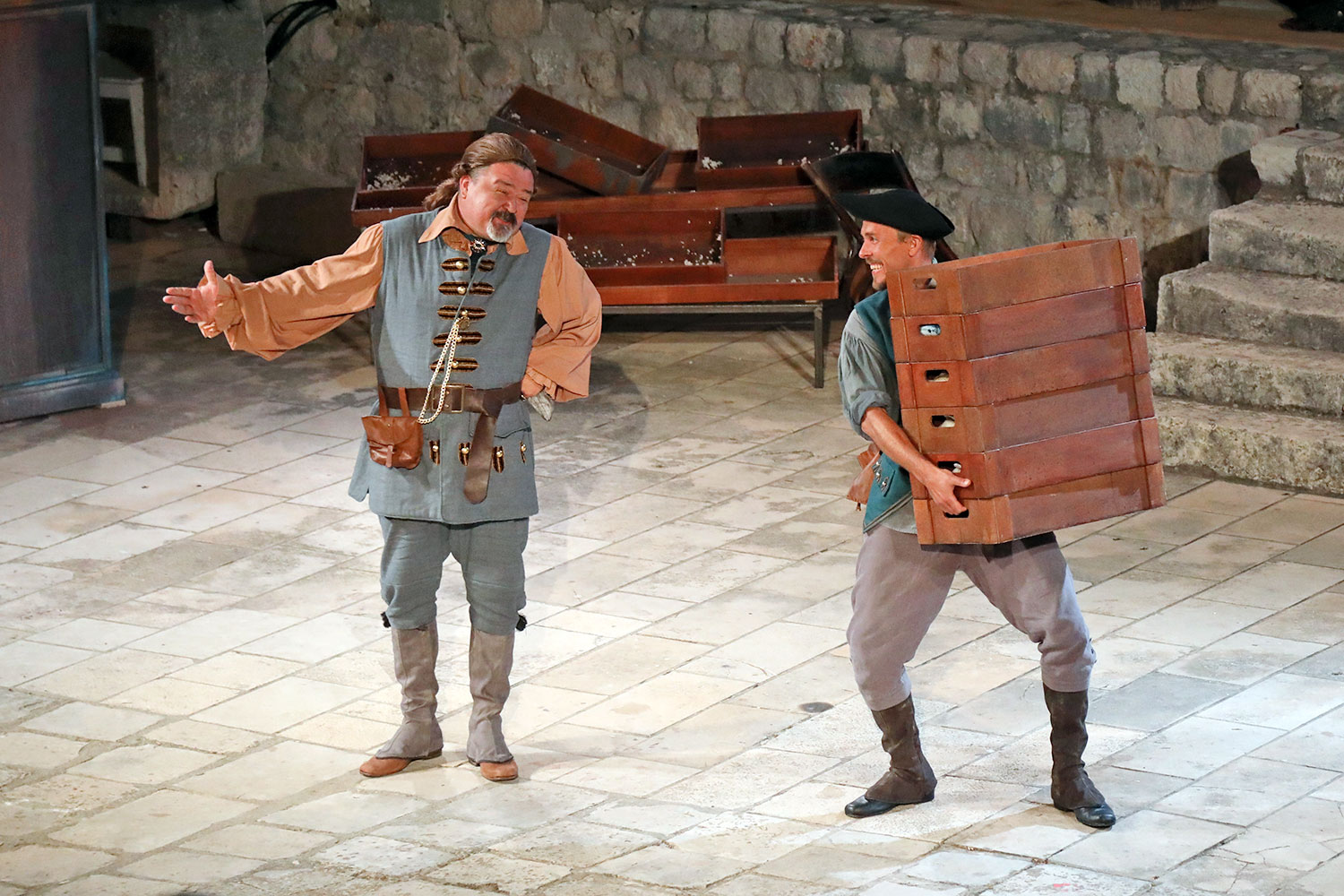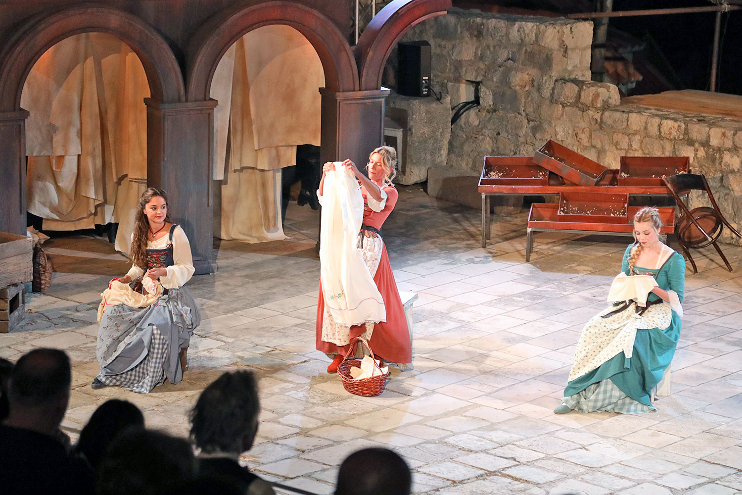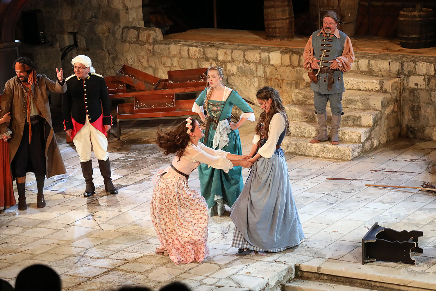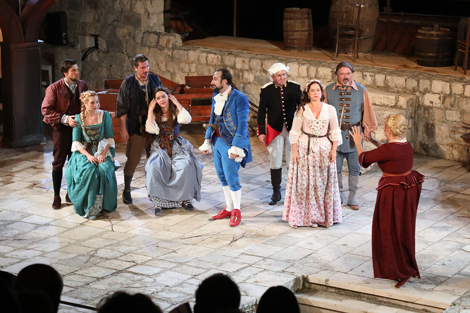 Glumačku podjelu čine: Joško Ševo (patrun Tonko, vlasnik ribarnice), Ksenija Prohaska (gospođa Pavle, žena patruna Tonka), Nika Lasić (Luce, djevojčica, sestra patruna Tonka), Bojan Beribaka (Đivo, mladi ribar), Nikola Radoš (Baldo, mladić, brat patruna Tonka), Borko Perić (patrun Nikša), Angela Bulum (gospođa Made, žena patruna Nikše), Nika Matušić (Ore, djevojčica, sestra gospođe Made), Nikolina Prkačin (Franica, druga djevojčica, sestra gospođe Made), Boris Matić (gospar Vice, ribar), Stipe Radoja (Duje, barkariol), Marijan Nejašmić Banić (Šiško, zamjenik kancelara Kaznenog suda), Branimir Vidić Flika (Zdur, glasnik kaznenog suda), Maro Drobnić (Vlaho/kanjac), Luka Bokić (Mol), Božo Petrić (Fra Božo). Svojom glazbom prvi premijerni naslov Igara su obogatili članovi Gradske glazbe Dubrovnik.