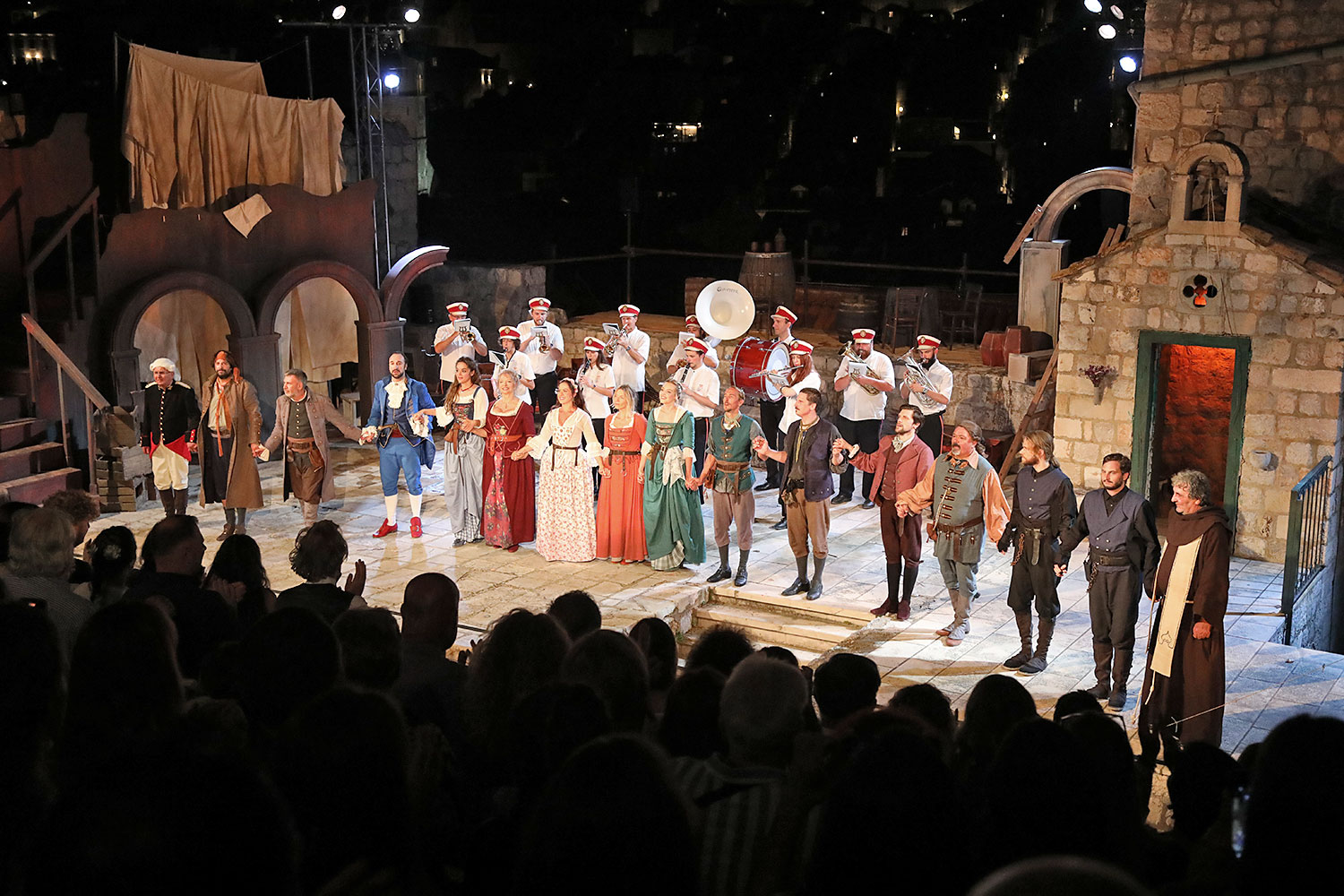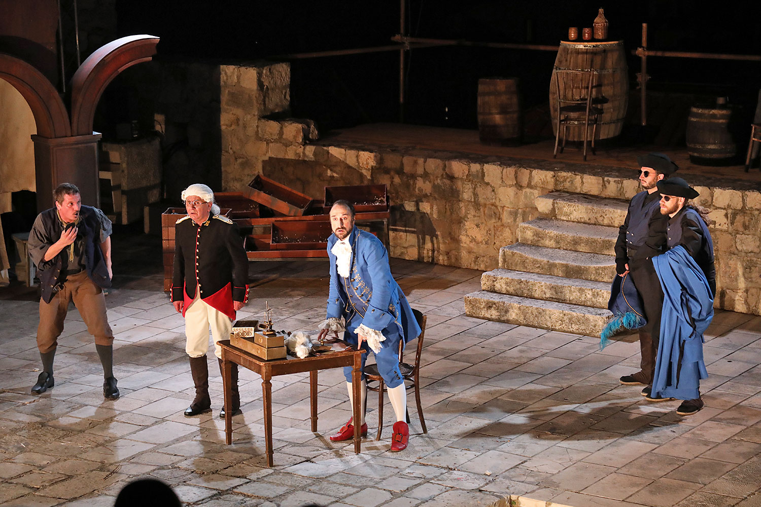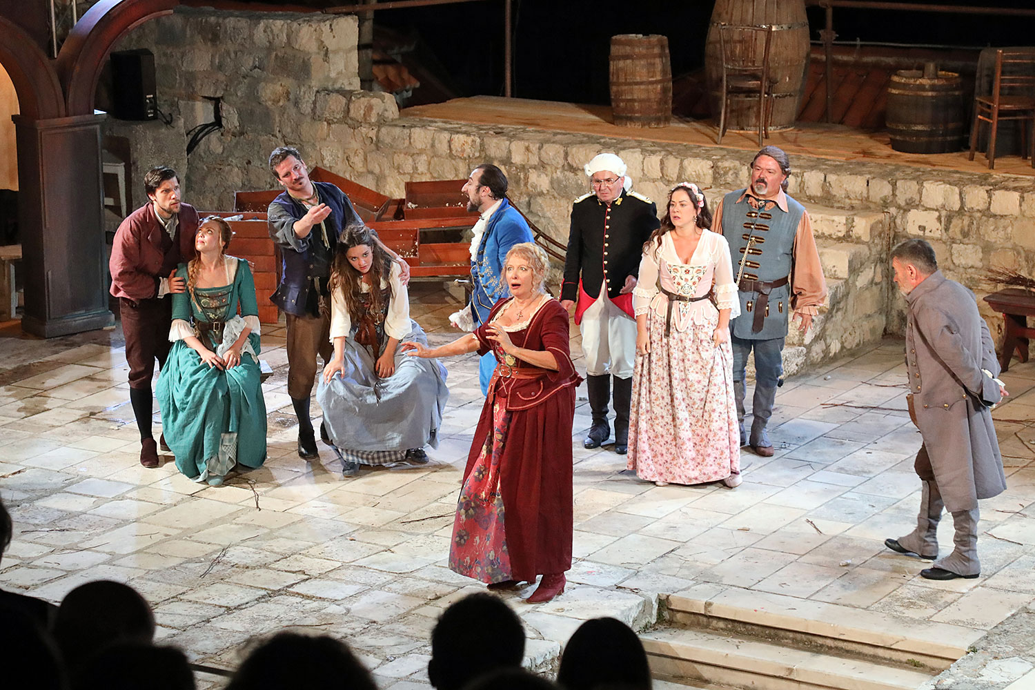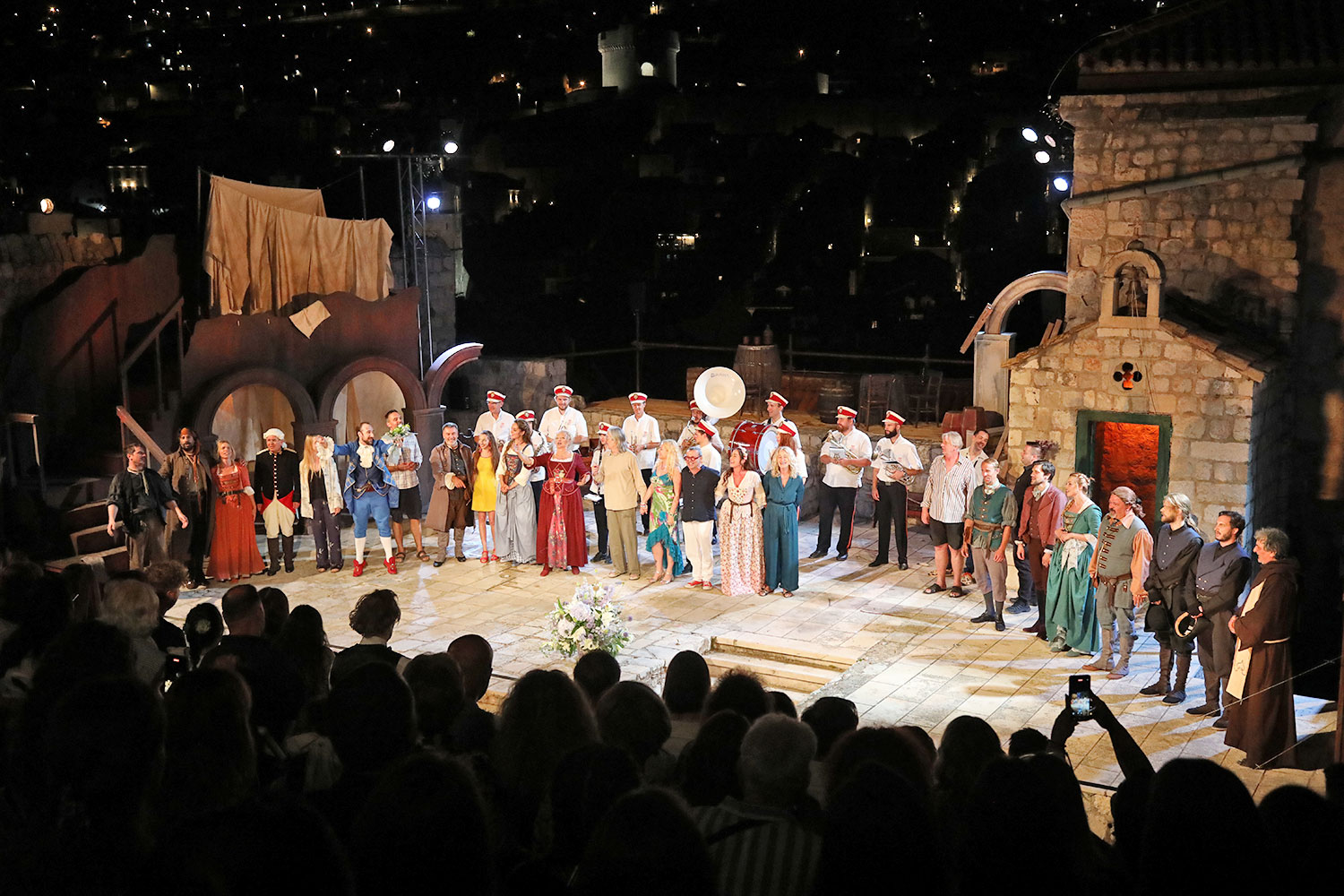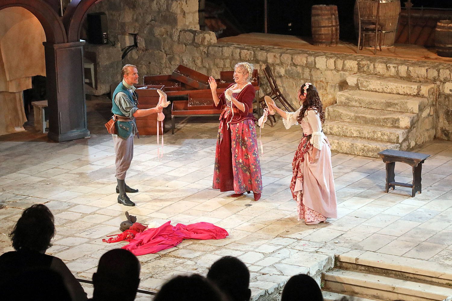 Glumačku podjelu čine: Joško Ševo (patrun Tonko, vlasnik ribarnice), Ksenija Prohaska (gospođa Pavle, žena patruna Tonka), Nika Lasić (Luce, djevojčica, sestra patruna Tonka), Bojan Beribaka (Đivo, mladi ribar), Nikola Radoš (Baldo, mladić, brat patruna Tonka), Borko Perić (patrun Nikša), Angela Bulum (gospođa Made, žena patruna Nikše), Nika Matušić (Ore, djevojčica, sestra gospođe Made), Nikolina Prkačin (Franica, druga djevojčica, sestra gospođe Made), Boris Matić (gospar Vice, ribar), Stipe Radoja (Duje, barkariol), Marijan Nejašmić Banić (Šiško, zamjenik kancelara Kaznenog suda), Branimir Vidić Flika (Zdur, glasnik kaznenog suda), Maro Drobnić (Vlaho/kanjac), Luka Bokić (Mol), Božo Petrić (Fra Božo). Svojom glazbom prvi premijerni naslov Igara su obogatili članovi Gradske glazbe Dubrovnik.