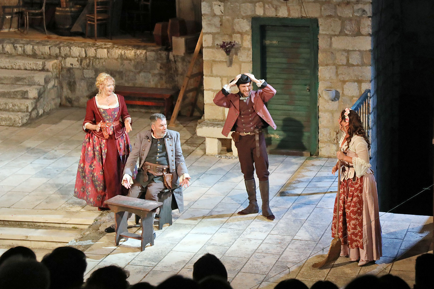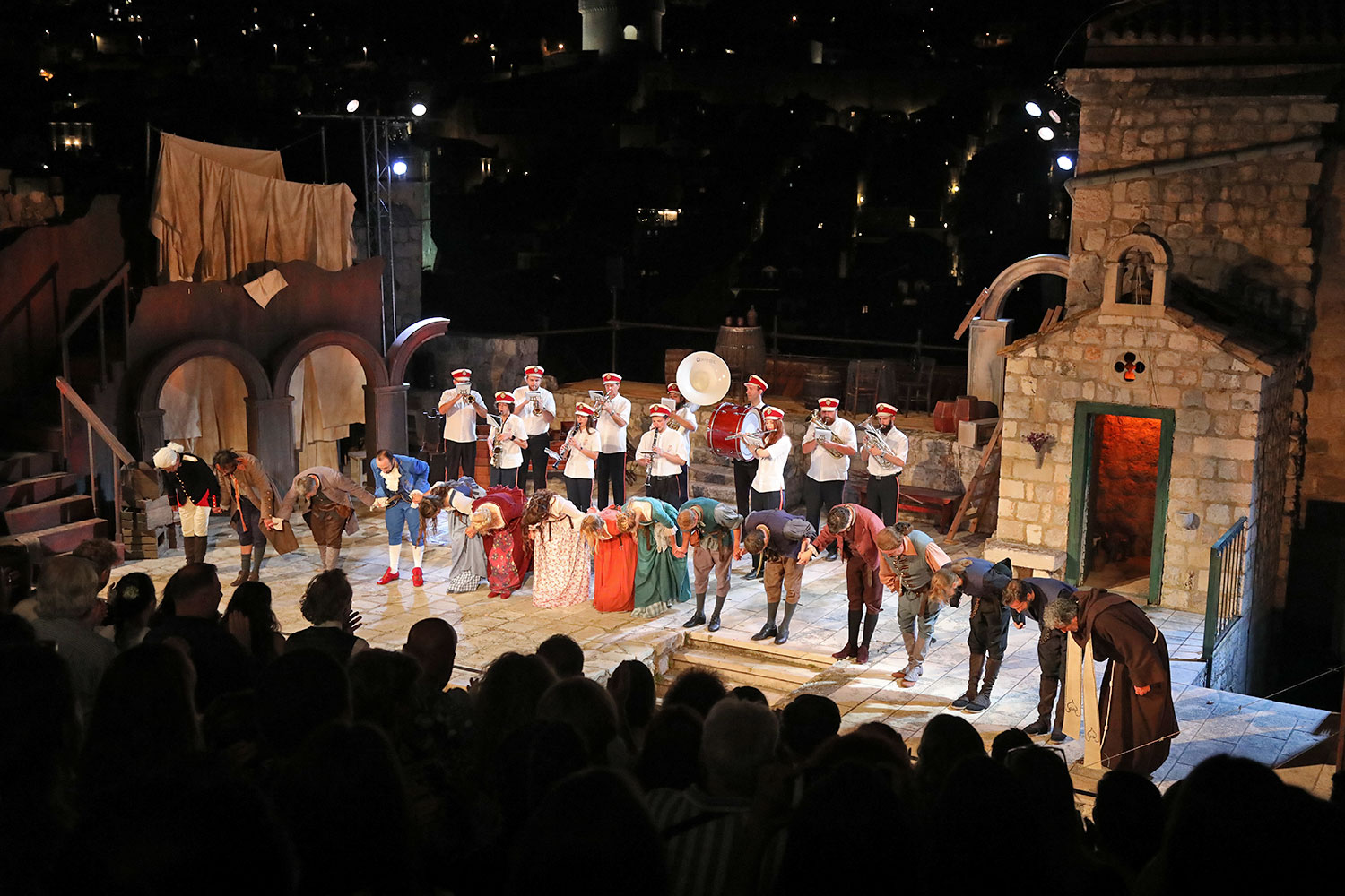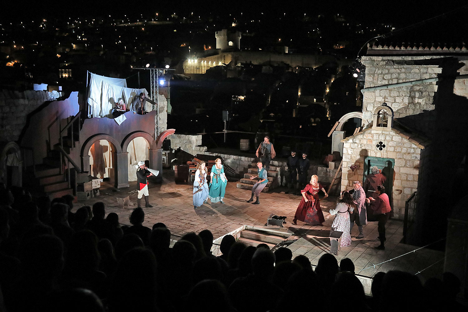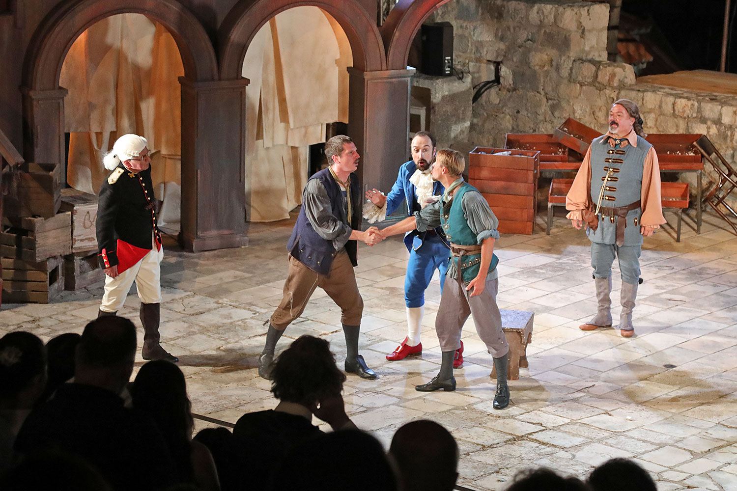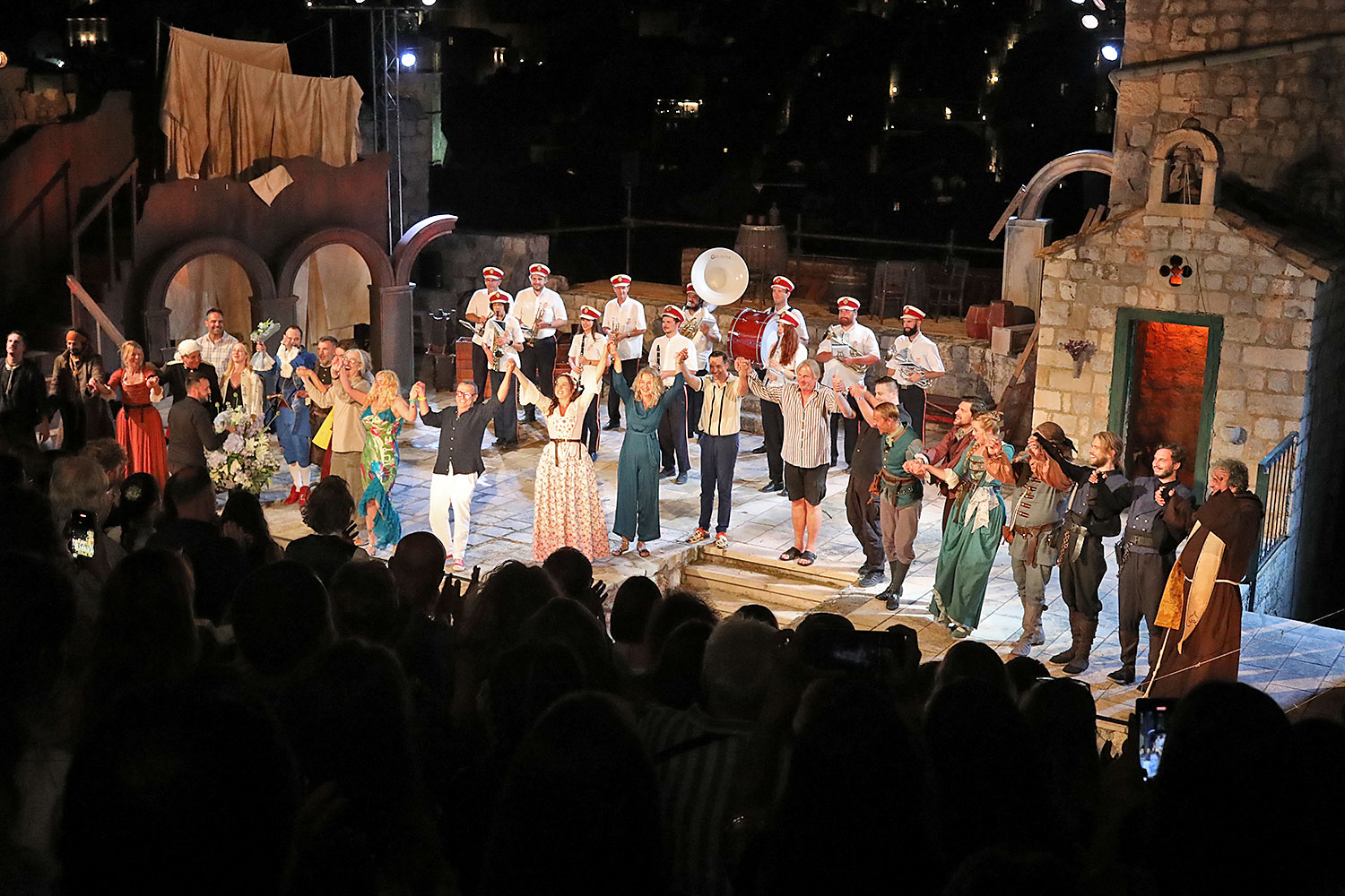 Glumačku podjelu čine: Joško Ševo (patrun Tonko, vlasnik ribarnice), Ksenija Prohaska (gospođa Pavle, žena patruna Tonka), Nika Lasić (Luce, djevojčica, sestra patruna Tonka), Bojan Beribaka (Đivo, mladi ribar), Nikola Radoš (Baldo, mladić, brat patruna Tonka), Borko Perić (patrun Nikša), Angela Bulum (gospođa Made, žena patruna Nikše), Nika Matušić (Ore, djevojčica, sestra gospođe Made), Nikolina Prkačin (Franica, druga djevojčica, sestra gospođe Made), Boris Matić (gospar Vice, ribar), Stipe Radoja (Duje, barkariol), Marijan Nejašmić Banić (Šiško, zamjenik kancelara Kaznenog suda), Branimir Vidić Flika (Zdur, glasnik kaznenog suda), Maro Drobnić (Vlaho/kanjac), Luka Bokić (Mol), Božo Petrić (Fra Božo). Svojom glazbom prvi premijerni naslov Igara su obogatili članovi Gradske glazbe Dubrovnik.