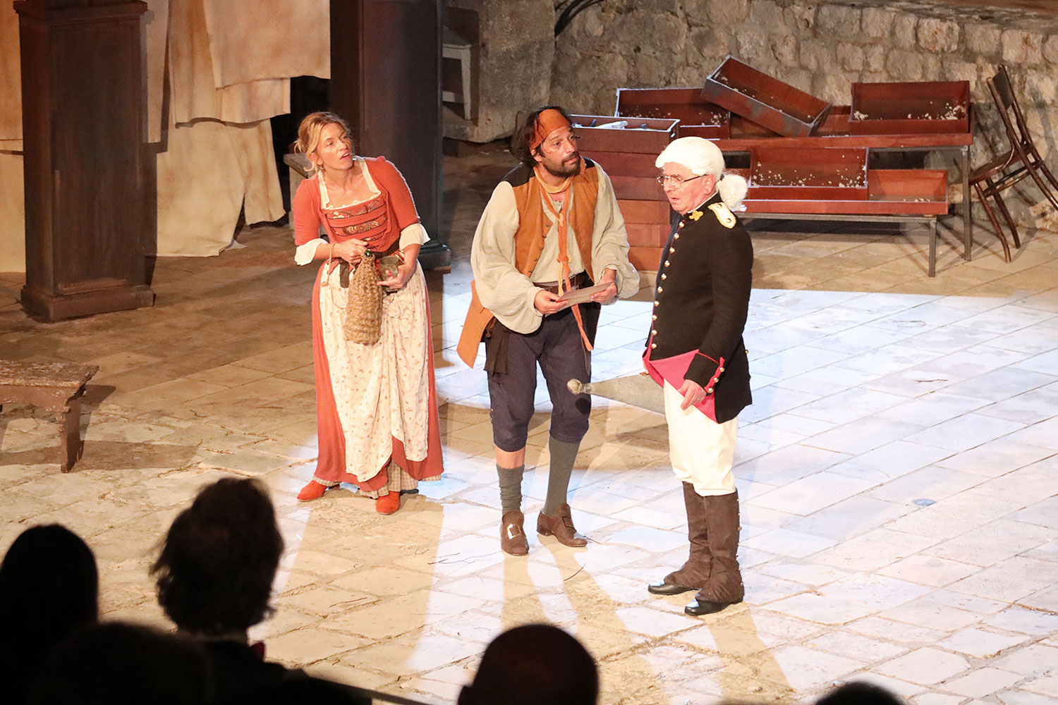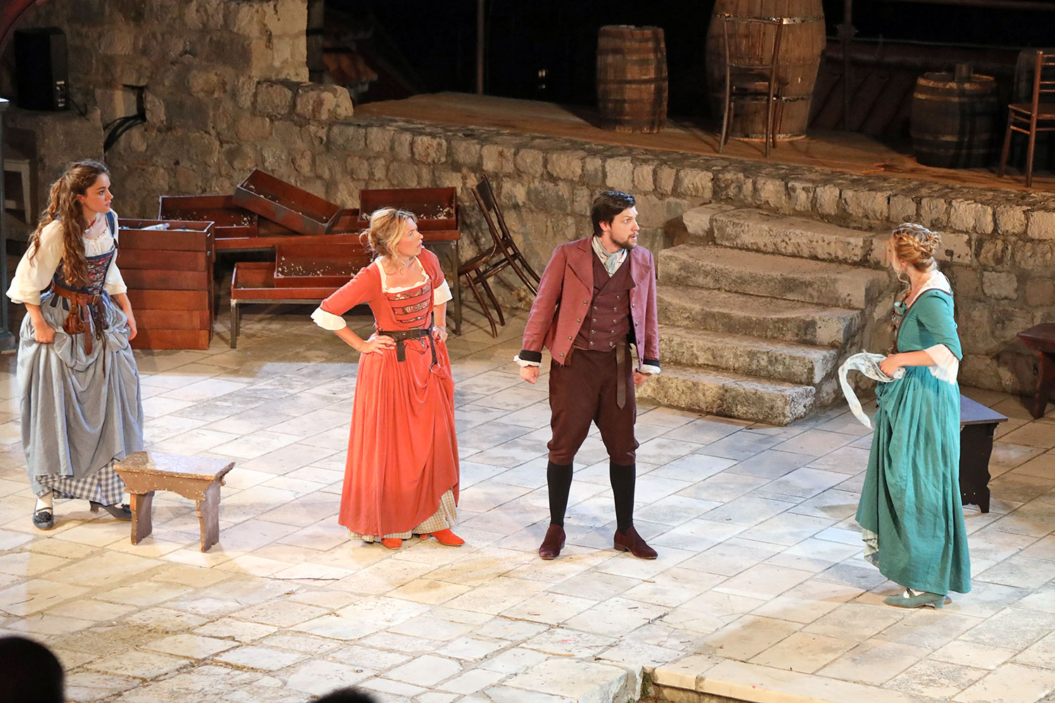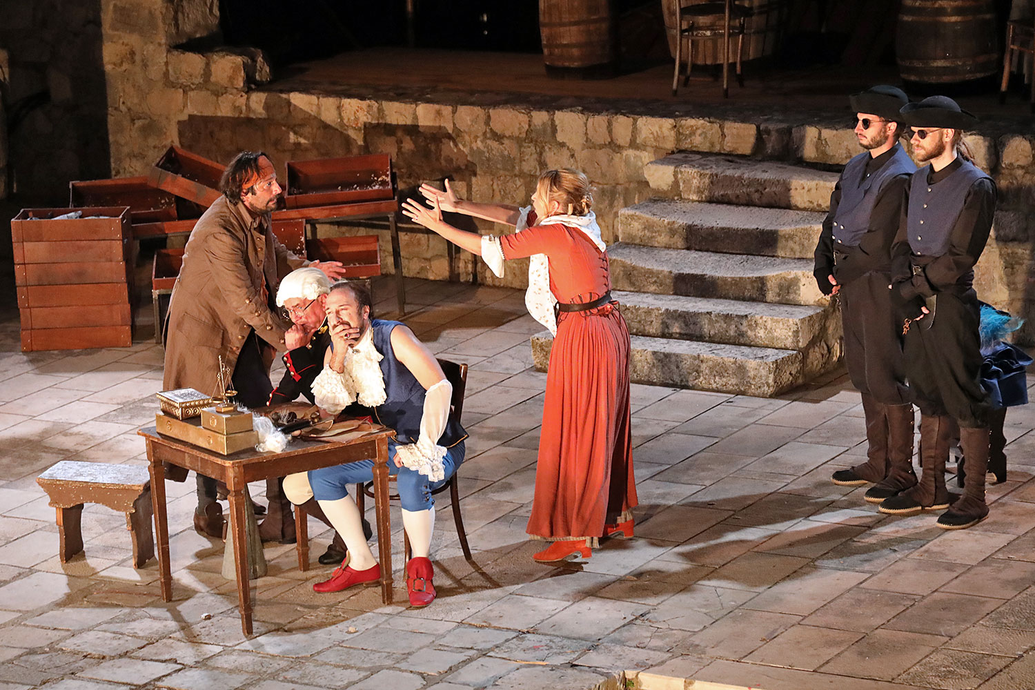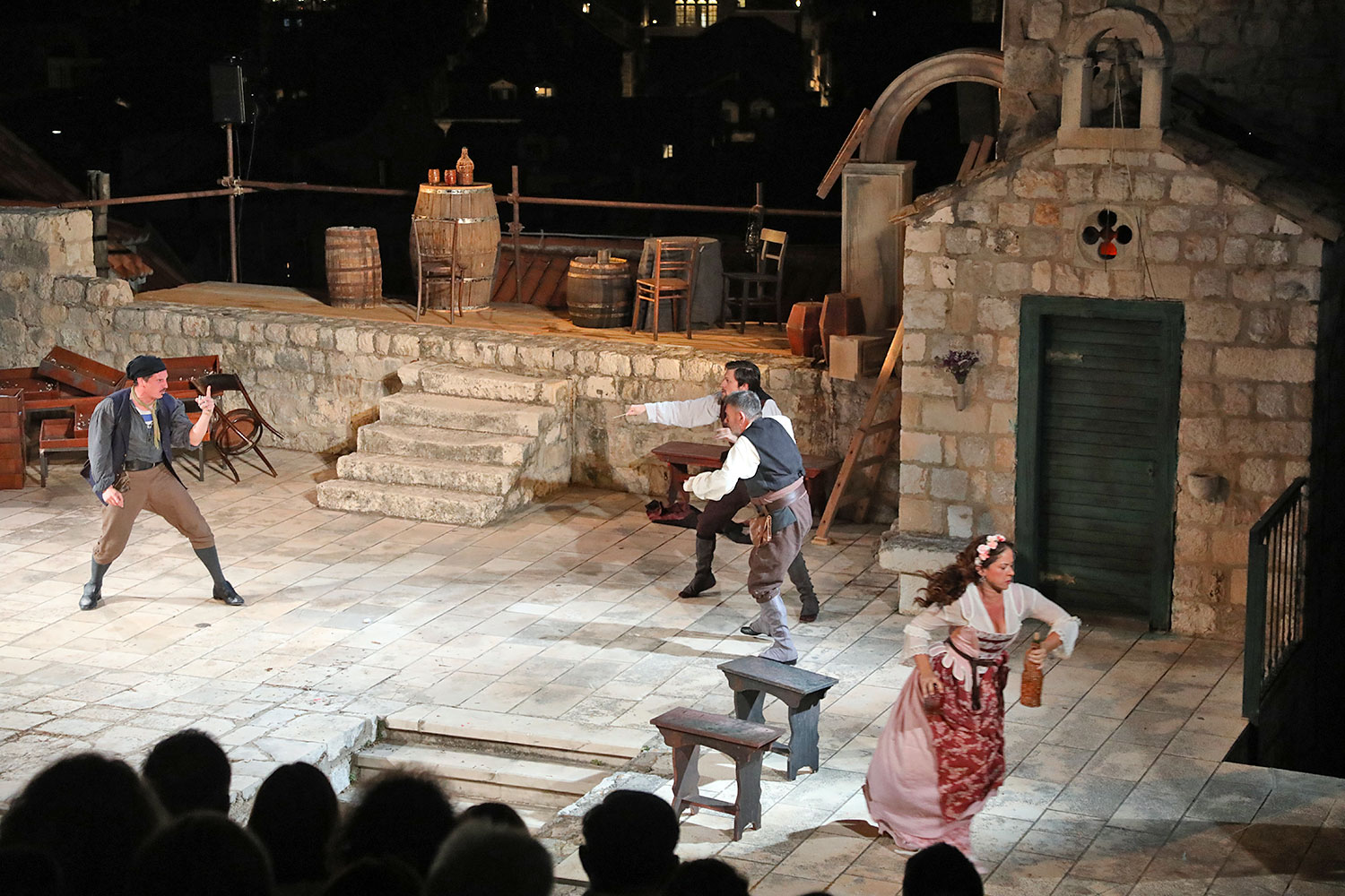 Glumačku podjelu čine: Joško Ševo (patrun Tonko, vlasnik ribarnice), Ksenija Prohaska (gospođa Pavle, žena patruna Tonka), Nika Lasić (Luce, djevojčica, sestra patruna Tonka), Bojan Beribaka (Đivo, mladi ribar), Nikola Radoš (Baldo, mladić, brat patruna Tonka), Borko Perić (patrun Nikša), Angela Bulum (gospođa Made, žena patruna Nikše), Nika Matušić (Ore, djevojčica, sestra gospođe Made), Nikolina Prkačin (Franica, druga djevojčica, sestra gospođe Made), Boris Matić (gospar Vice, ribar), Stipe Radoja (Duje, barkariol), Marijan Nejašmić Banić (Šiško, zamjenik kancelara Kaznenog suda), Branimir Vidić Flika (Zdur, glasnik kaznenog suda), Maro Drobnić (Vlaho/kanjac), Luka Bokić (Mol), Božo Petrić (Fra Božo). Svojom glazbom prvi premijerni naslov Igara su obogatili članovi Gradske glazbe Dubrovnik.