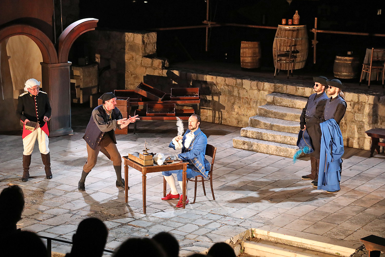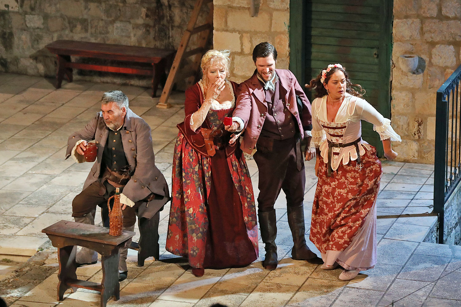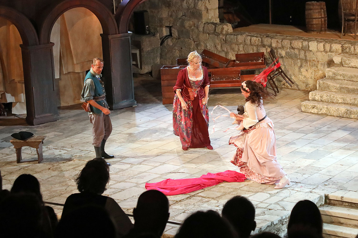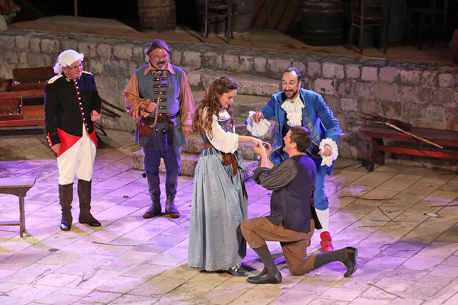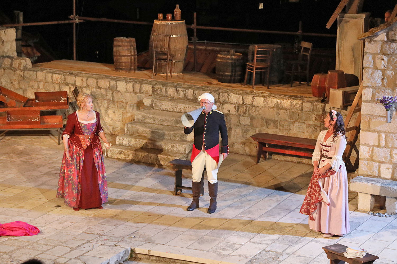 Glumačku podjelu čine: Joško Ševo (patrun Tonko, vlasnik ribarnice), Ksenija Prohaska (gospođa Pavle, žena patruna Tonka), Nika Lasić (Luce, djevojčica, sestra patruna Tonka), Bojan Beribaka (Đivo, mladi ribar), Nikola Radoš (Baldo, mladić, brat patruna Tonka), Borko Perić (patrun Nikša), Angela Bulum (gospođa Made, žena patruna Nikše), Nika Matušić (Ore, djevojčica, sestra gospođe Made), Nikolina Prkačin (Franica, druga djevojčica, sestra gospođe Made), Boris Matić (gospar Vice, ribar), Stipe Radoja (Duje, barkariol), Marijan Nejašmić Banić (Šiško, zamjenik kancelara Kaznenog suda), Branimir Vidić Flika (Zdur, glasnik kaznenog suda), Maro Drobnić (Vlaho/kanjac), Luka Bokić (Mol), Božo Petrić (Fra Božo). Svojom glazbom prvi premijerni naslov Igara su obogatili članovi Gradske glazbe Dubrovnik.