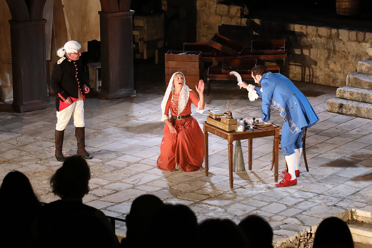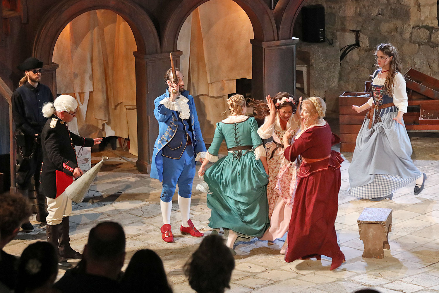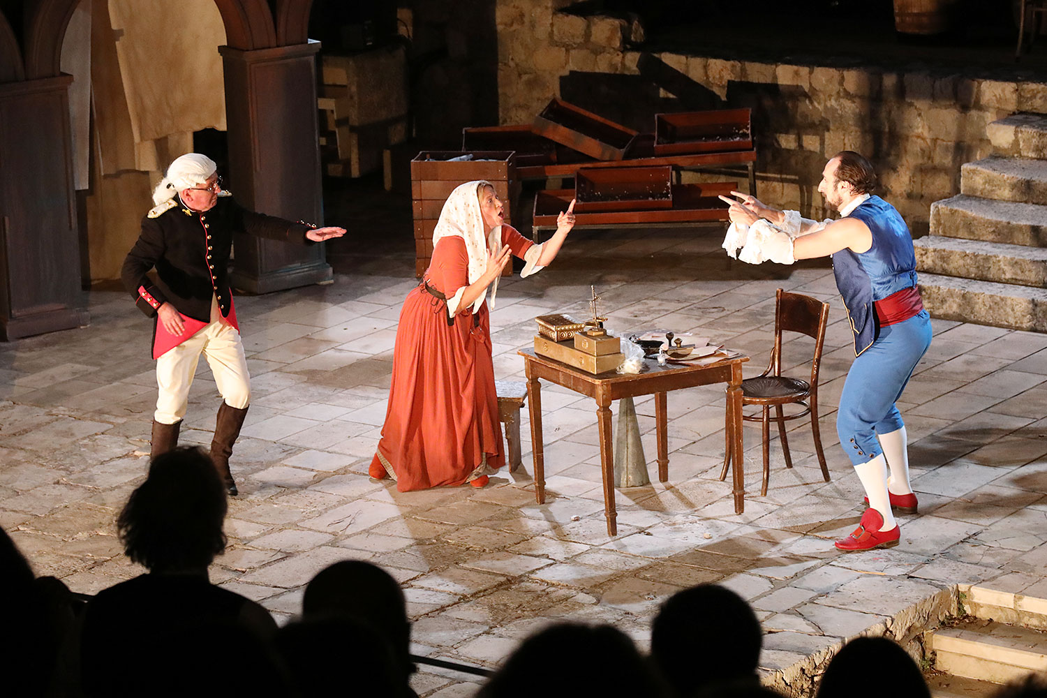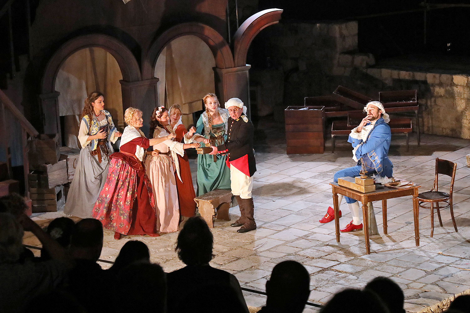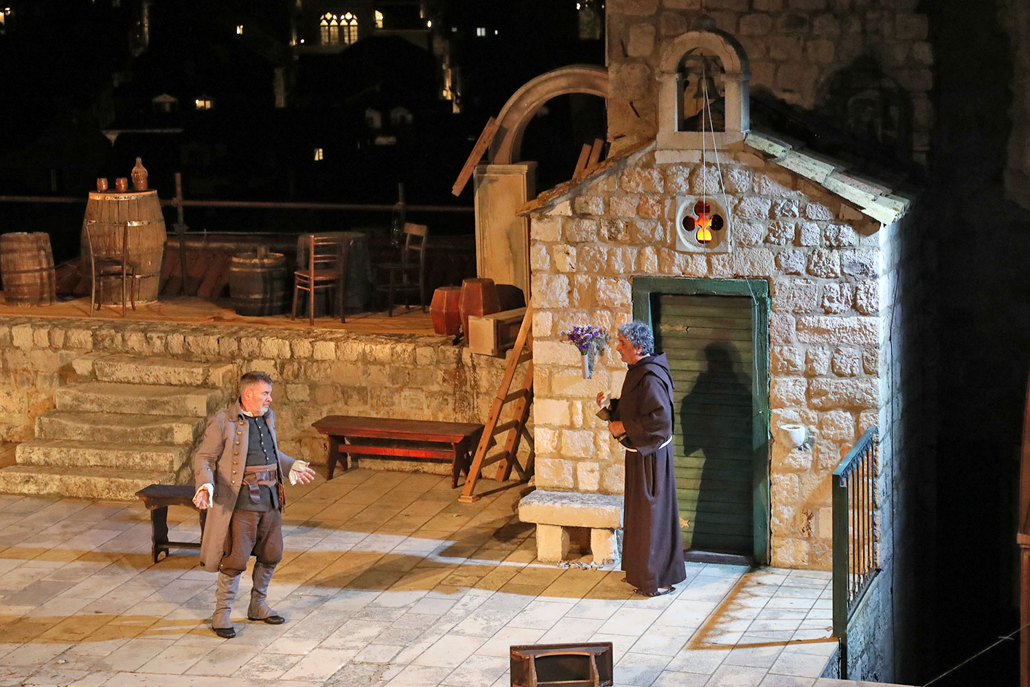 Glumačku podjelu čine: Joško Ševo (patrun Tonko, vlasnik ribarnice), Ksenija Prohaska (gospođa Pavle, žena patruna Tonka), Nika Lasić (Luce, djevojčica, sestra patruna Tonka), Bojan Beribaka (Đivo, mladi ribar), Nikola Radoš (Baldo, mladić, brat patruna Tonka), Borko Perić (patrun Nikša), Angela Bulum (gospođa Made, žena patruna Nikše), Nika Matušić (Ore, djevojčica, sestra gospođe Made), Nikolina Prkačin (Franica, druga djevojčica, sestra gospođe Made), Boris Matić (gospar Vice, ribar), Stipe Radoja (Duje, barkariol), Marijan Nejašmić Banić (Šiško, zamjenik kancelara Kaznenog suda), Branimir Vidić Flika (Zdur, glasnik kaznenog suda), Maro Drobnić (Vlaho/kanjac), Luka Bokić (Mol), Božo Petrić (Fra Božo). Svojom glazbom prvi premijerni naslov Igara su obogatili članovi Gradske glazbe Dubrovnik.