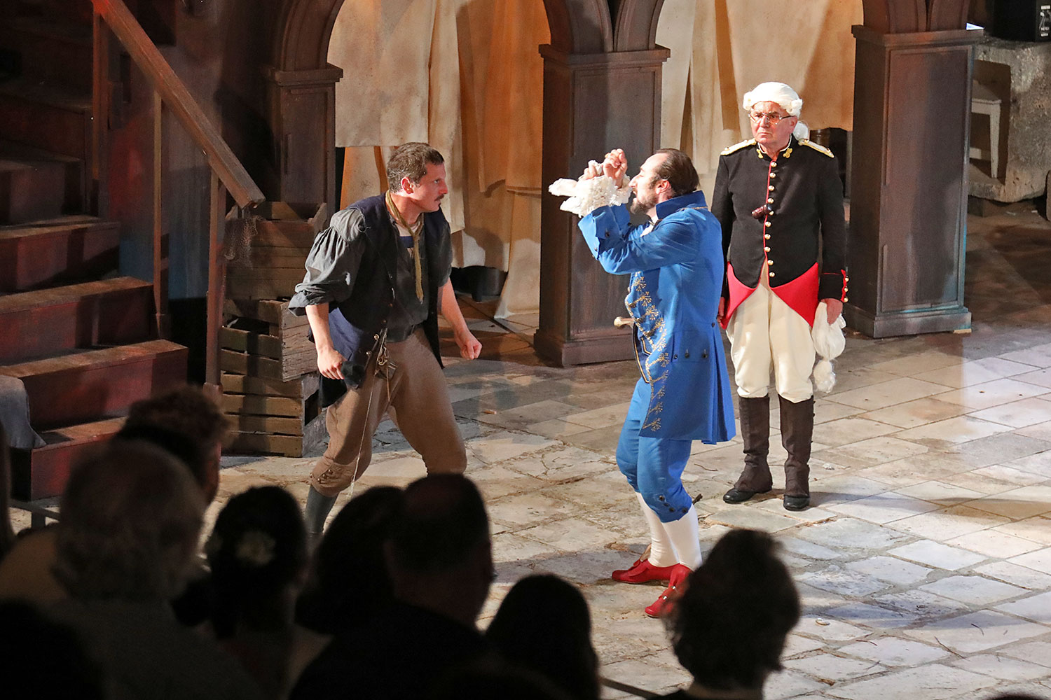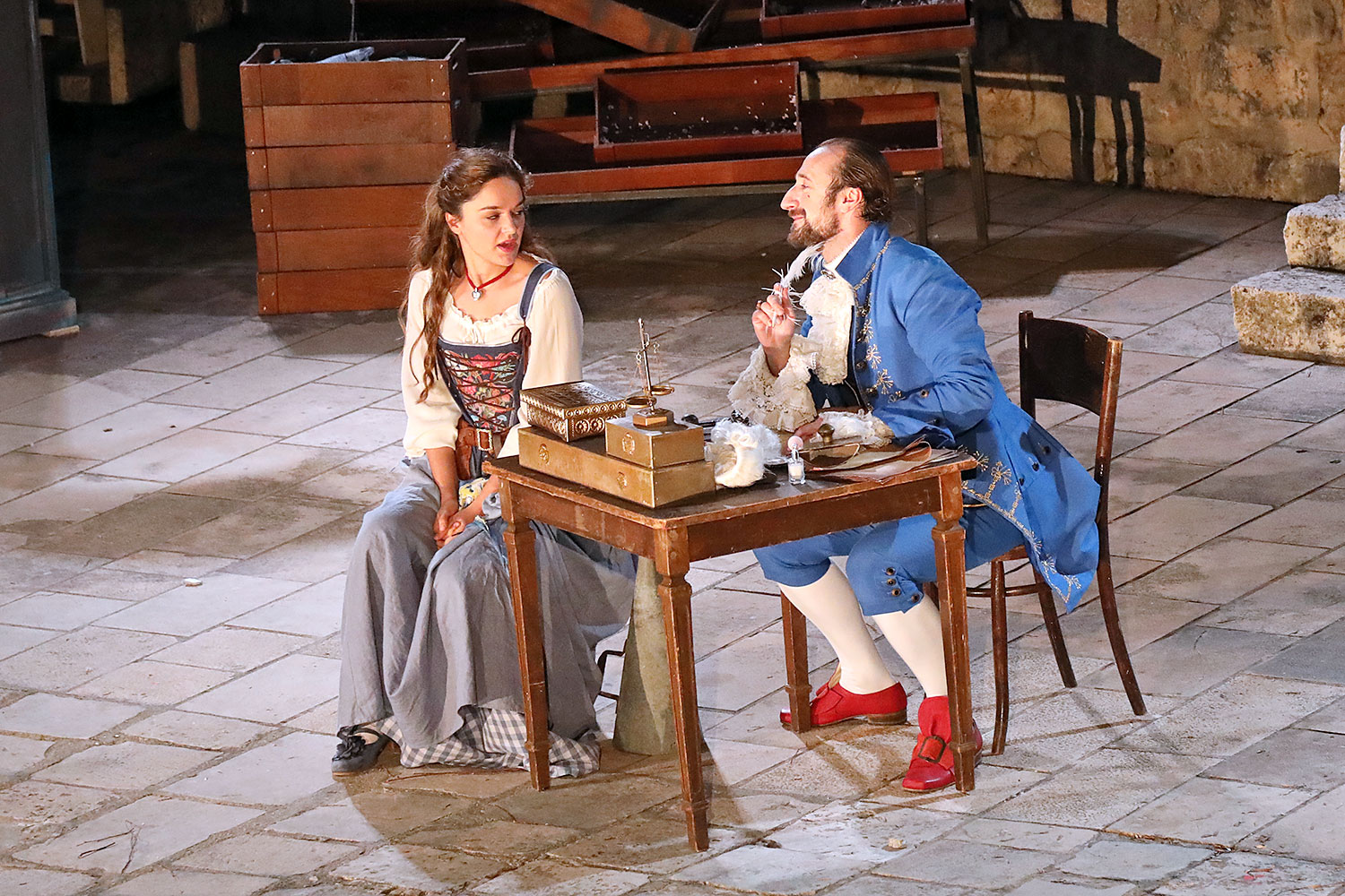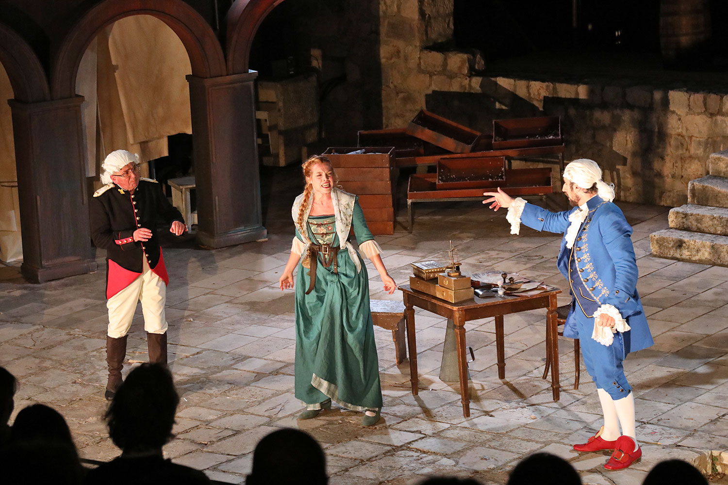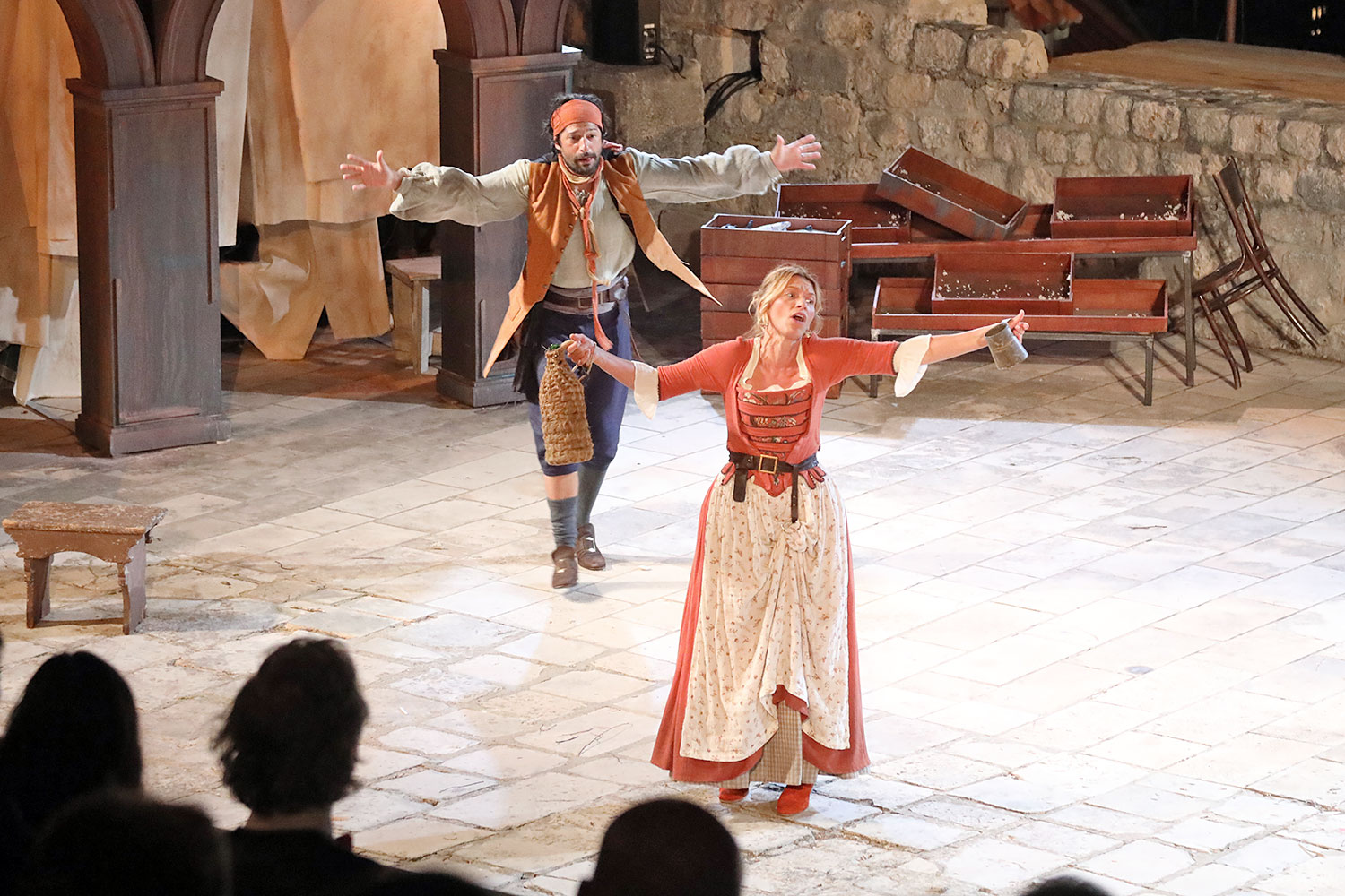 Glumačku podjelu čine: Joško Ševo (patrun Tonko, vlasnik ribarnice), Ksenija Prohaska (gospođa Pavle, žena patruna Tonka), Nika Lasić (Luce, djevojčica, sestra patruna Tonka), Bojan Beribaka (Đivo, mladi ribar), Nikola Radoš (Baldo, mladić, brat patruna Tonka), Borko Perić (patrun Nikša), Angela Bulum (gospođa Made, žena patruna Nikše), Nika Matušić (Ore, djevojčica, sestra gospođe Made), Nikolina Prkačin (Franica, druga djevojčica, sestra gospođe Made), Boris Matić (gospar Vice, ribar), Stipe Radoja (Duje, barkariol), Marijan Nejašmić Banić (Šiško, zamjenik kancelara Kaznenog suda), Branimir Vidić Flika (Zdur, glasnik kaznenog suda), Maro Drobnić (Vlaho/kanjac), Luka Bokić (Mol), Božo Petrić (Fra Božo). Svojom glazbom prvi premijerni naslov Igara su obogatili članovi Gradske glazbe Dubrovnik.