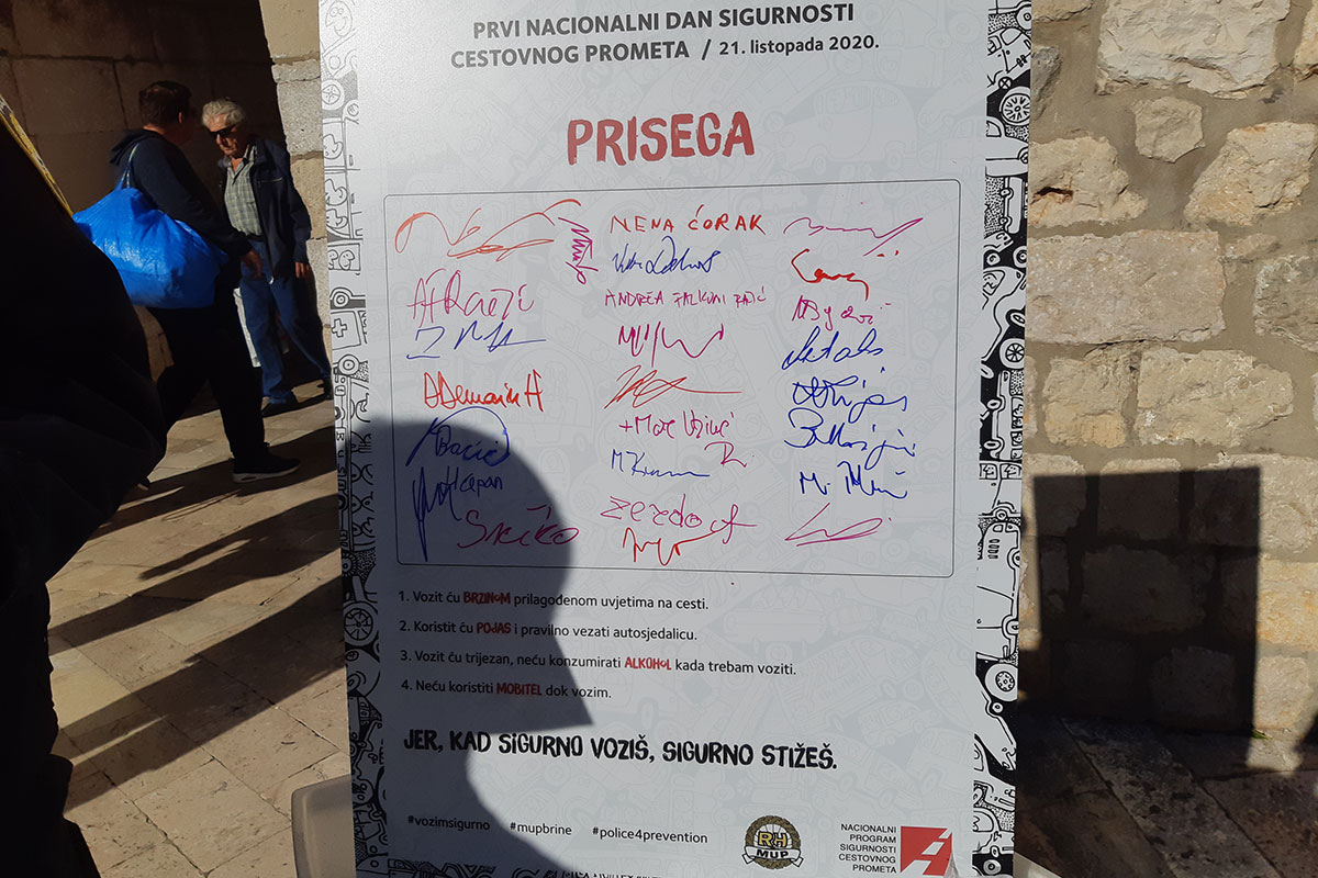 Građani su tom prilikom potpisivali prisegu kojom se simbolično obvezuju pridržavati se prometnih propisa, a za uzvrat su dobili bedž i naljepnicu „KAD SIGURNO VOZIŠ, SIGURNO STIŽEŠ“ što je ujedno parola ove preventivne aktivnosti.