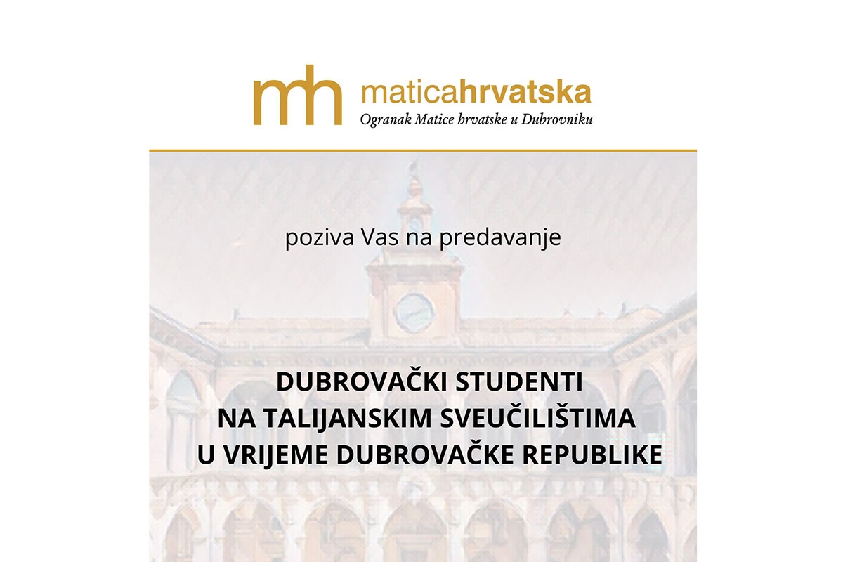 Ogranak Matice hrvatske u Dubrovniku poziva Vas na predavanje Dubrovački studenti na talijanskim sveučilištima u vrijeme Dubrovačke Republike koje će održati dr.sc. Monika Grdiša Asić u srijedu, 16. studenog 2022. u 18 sati – Čitaonica Narodne knjižnice Grad.