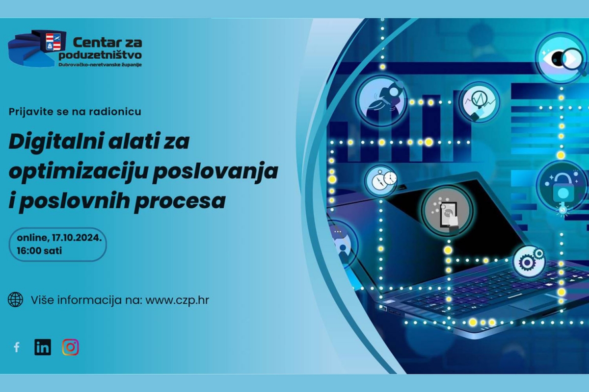 Kako biste što bolje razumjeli kako digitalni alati mogu unaprijediti vaše poslovanje i omogućiti vam da ostanete konkurentni u brzom svijetu poslovanja, Centar za poduzetništvo DNŽ organizira besplatnu online radionicu na temu Digitalni alati za optimizaciju poslovanja i poslovnih procesa.
