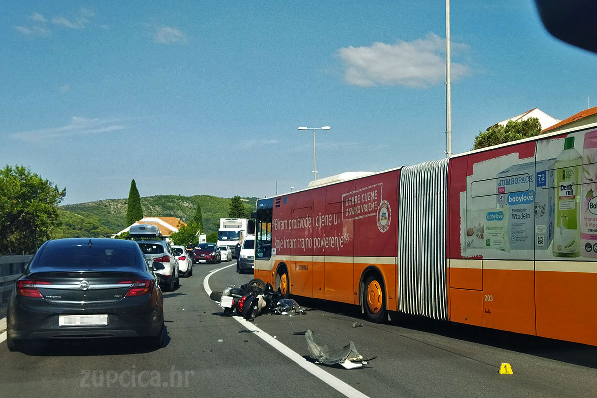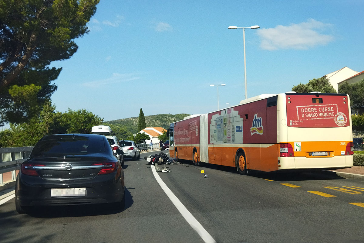 Jutros oko 7:50 h na magistrali na Trgovištu kod autobusne stanice u smjeru Grada se dogodila prometna nesreća u kojoj su sudjelovali Libertasov autobus motociklist te osobno vozilo. U tijeku je očevid, promet se odvija otežano jednim kolnim trakom uz regulaciju policije, a kako je uobičajenu u ovakvim situacijama nastala je velika kolona u oba smjera.