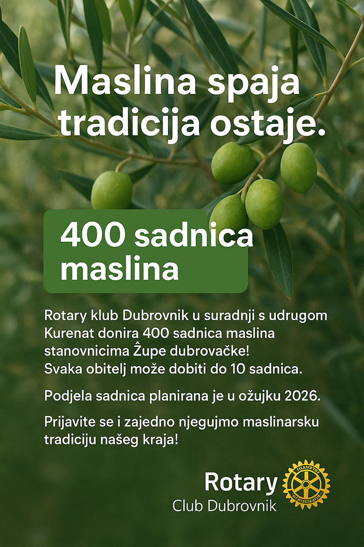 Stanovnicima Župe dubrovačke bit će donirano ukupno 400 sadnica maslina, a svaka obitelj može preuzeti do 10 sadnica. Time Rotary klub Dubrovnik želi potaknuti obnovu maslinika, podržati lokalne obitelji i doprinijeti očuvanju vrijedne kulturne baštine našega kraja.