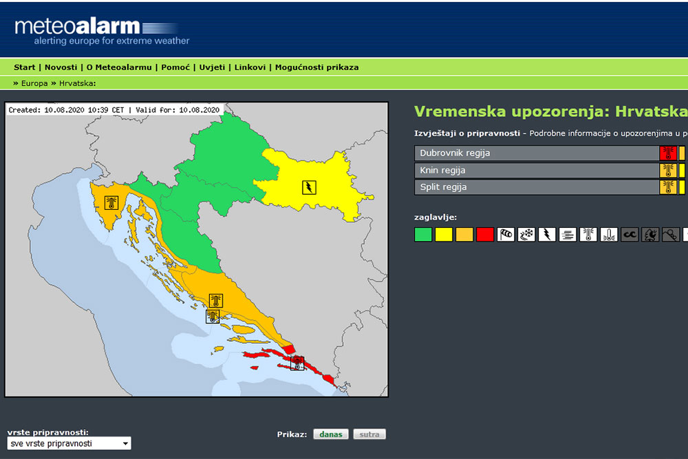Meteoalarm je za danas za dubrovačko područje izdao najveće crveno upozorenje na iznimno visoke temperature. Očekuju se ekstremno visoke temperature i preko 33°C, te topla i vrlo topla noć.