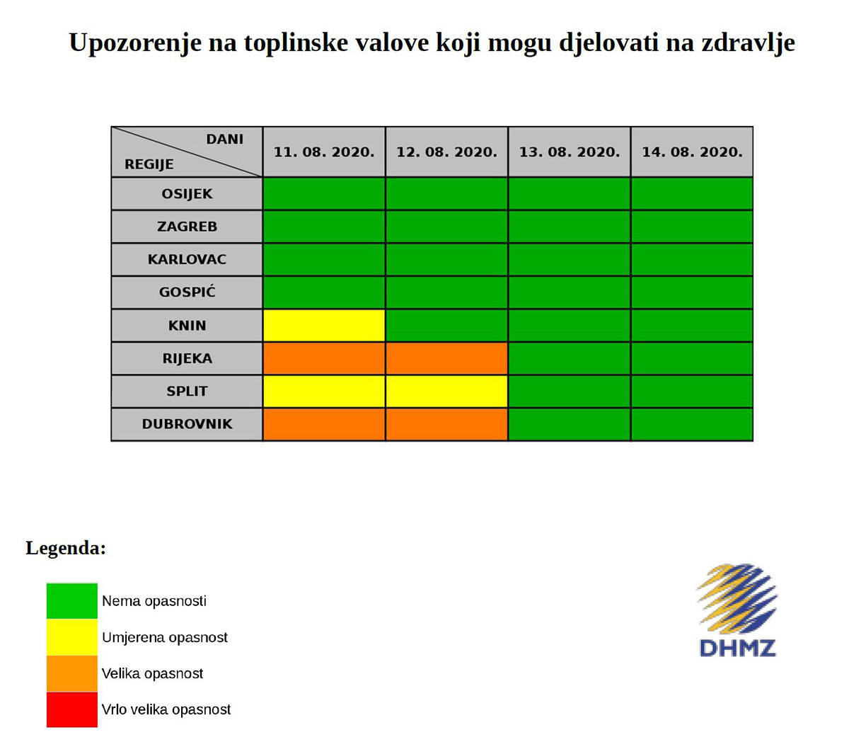 Za Dubrovačko-neretvansku županiju za utorak 11. i srijedu 12. kolovoza prognozirana je velika opasnost od pojave toplinskog vala, dok za četvrtak 13. i petak 14. kolovoza nema opasnosti od pojave toplinskog vala.