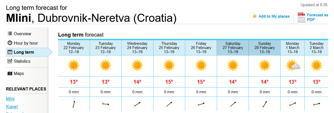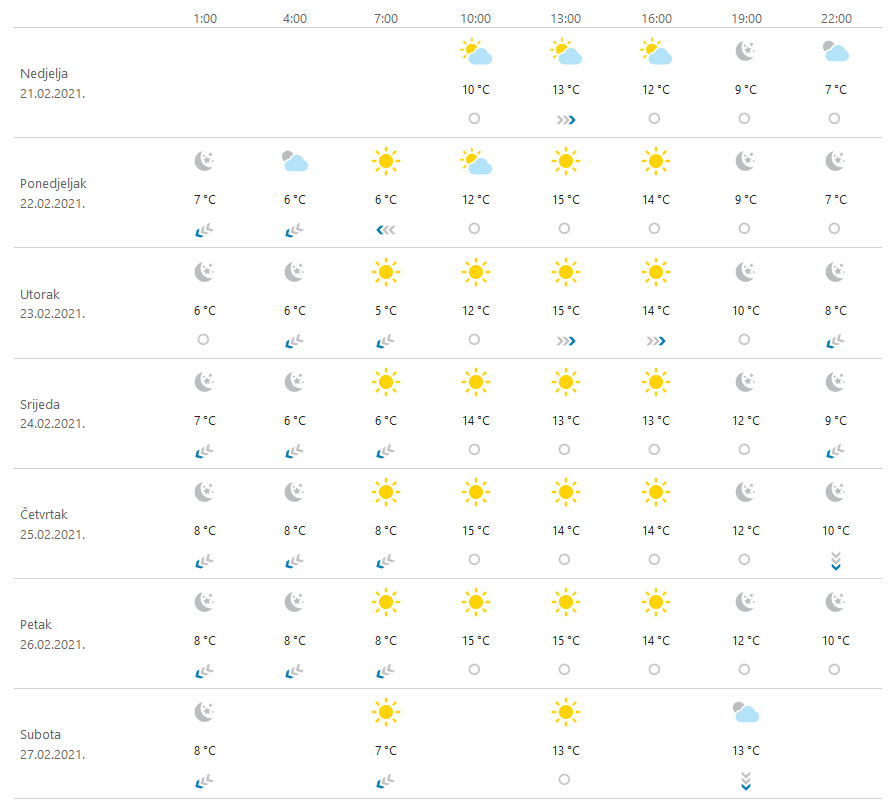 Prema prognozama Norveškog meteorološkog instituta (yr.no) u lijepo i toplo vrijeme koje imamo zadnjih dana će nas pratiti do kraja veljače, a i početkom ožujka. Uz sunčano vrijeme najviše dnevne temperature će biti između 12° i 15°C, a tijekom noći živa u termometru se neće spuštati ispod 5°C.