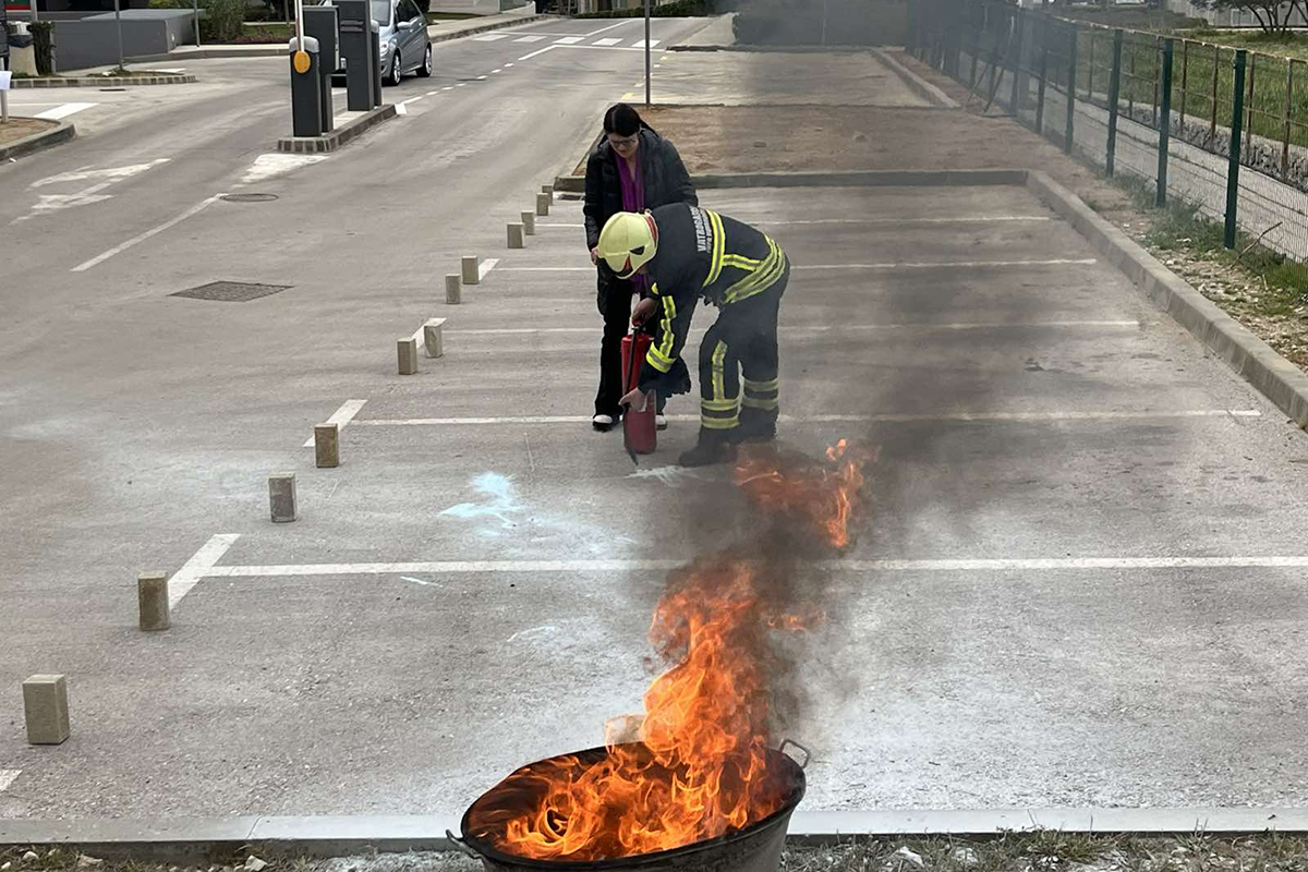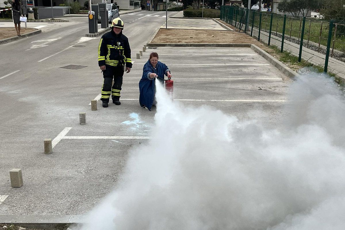 Uz dobivene upute o načinu rada s vatrogasnim aparatom te gašenju vatre u mogućem požaru na radnom mjestu, djelatnici hotela su imali priliku praktično vježbati gašenje upotrebom vatrogasnog aparata.
