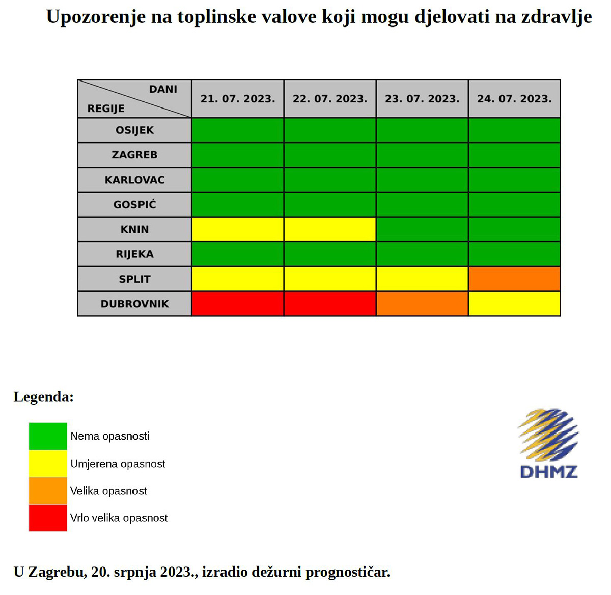 Za Dubrovačko-neretvansku županiju za petak 21. i subotu 22. srpnja prognozirana je vrlo velika opasnost od pojave toplinskog vala, za nedjelju 23. srpnja prognozirana je velika opasnost od toplinskog vala dok za ponedjeljak 24. srpnja 2023. prognozirana je umjerena opasnost od pojave toplinskog vala.