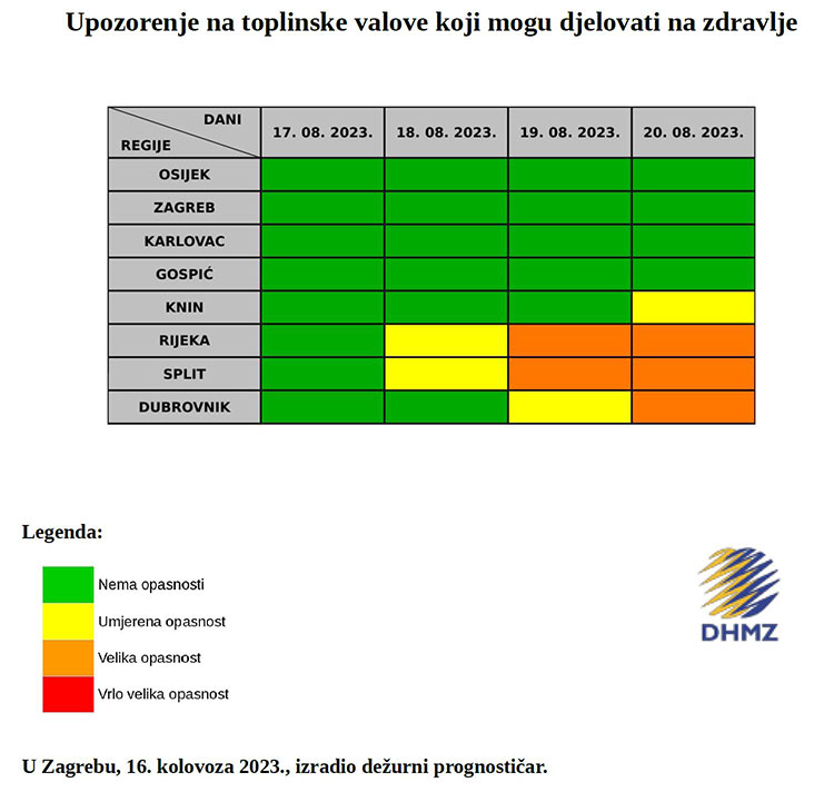 Za Dubrovačko-neretvansku županiju za subotu 19. kolovoza prognozirana je umjerena opasnost, za nedjelju 20. kolovoza prognozirana je velika opasnost od pojave toplinskog vala, dok za razdoblje četvrtak 17. i petak 18. kolovoza 2023. nema opasnosti od pojave toplinskog vala.