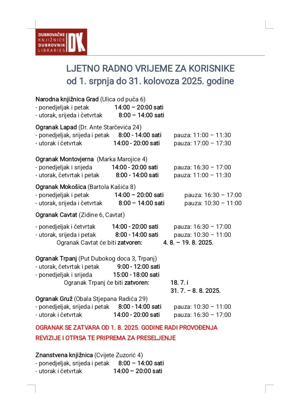 Dubrovačke knjižnice i ogranci prelaze na ljetno radno vrijeme za korisnike u razdoblju od 1. srpnja do 31. kolovoza 2025.