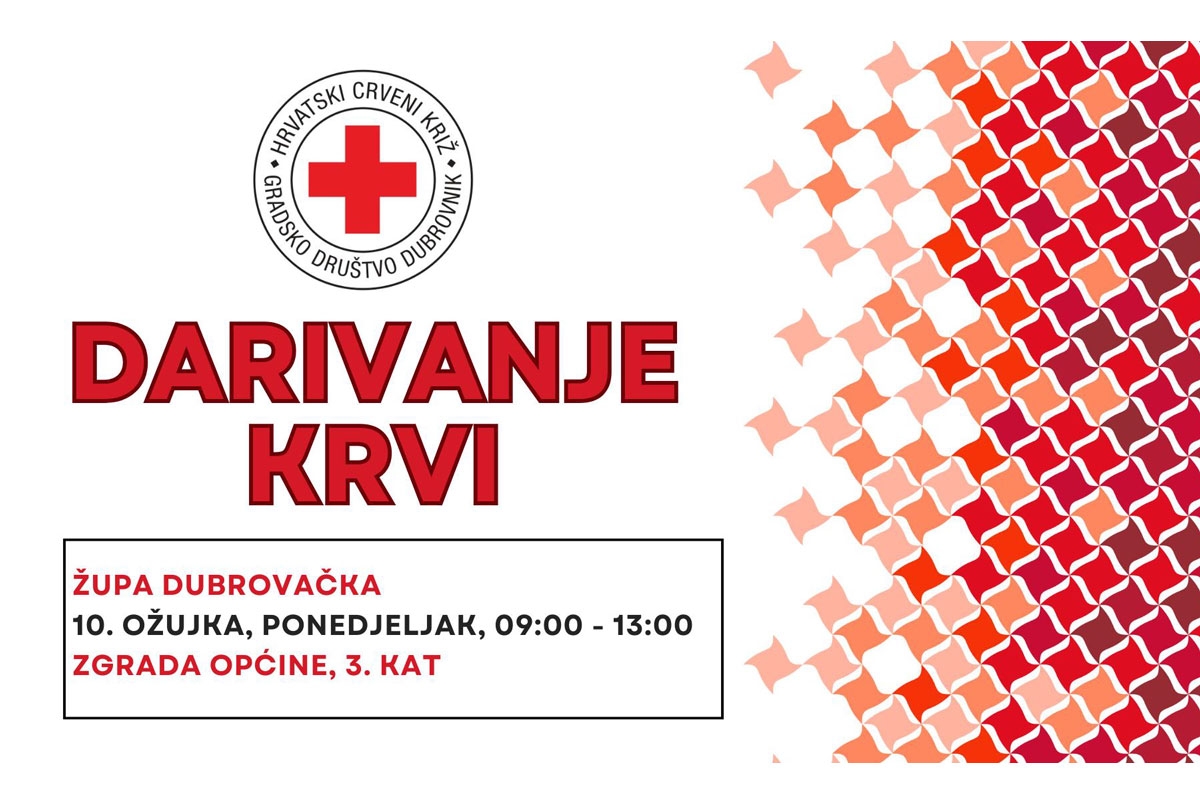 Gradsko društvo Crvenog križa Dubrovnik poziva na akciju darivanja krvi koja će se održati u ponedjeljak, 10. ožujka od 09:00 do 13:00 sati u zgradi Općine u Srebrenom.