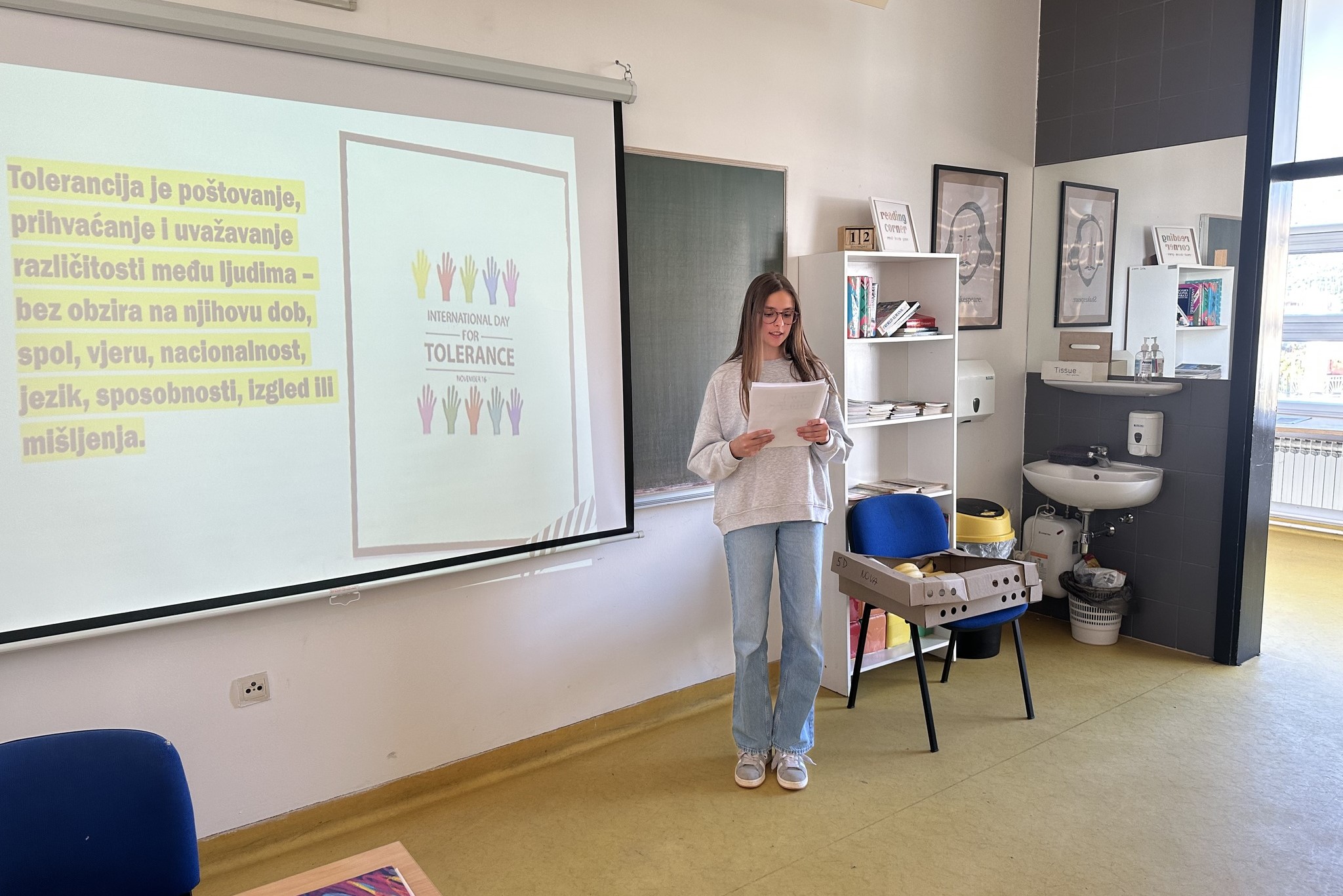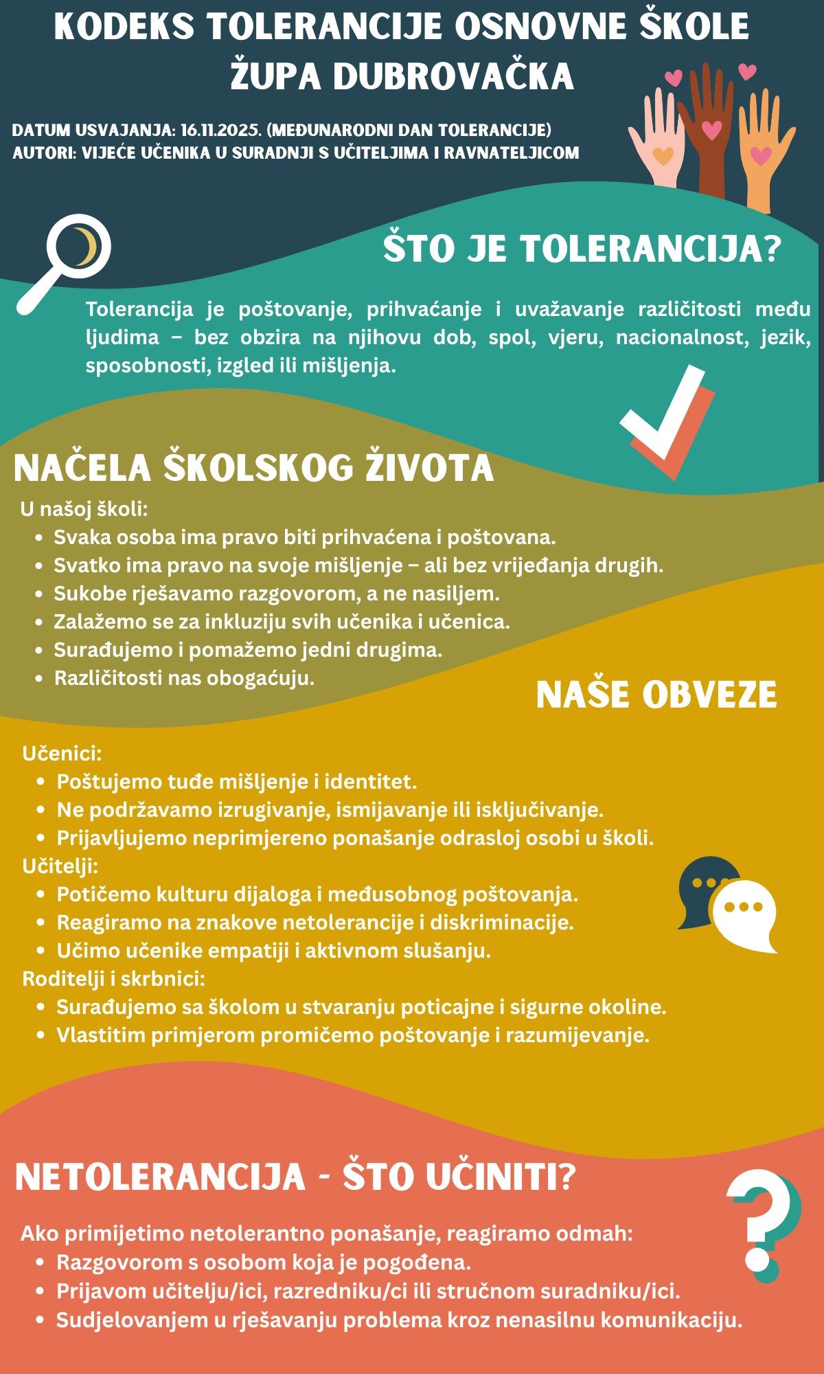Tijekom studenoga članovi Vijeća učenika, predstavnici sedmih i osmih razreda uključeni u izvannastavnu aktivnost „Nositelji promjena“, proveli su niz značajnih aktivnosti povodom obilježavanja Međunarodnog dana tolerancije. Kroz svoj angažman željeli su potaknuti vršnjačko učenje, razvijati međusobno poštovanje i osnažiti osjećaj zajedništva.