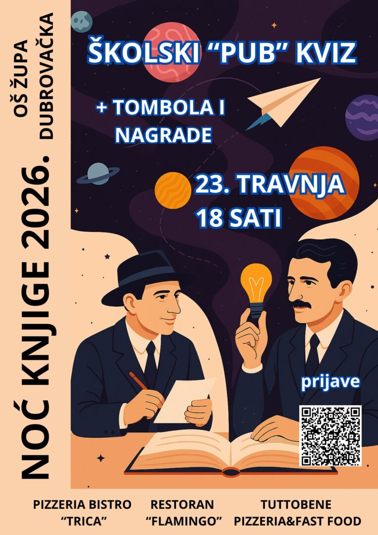I ove godine OŠ Župa dubrovačka organizira školski pub kviz za Noć knjige koji će se održati 23. travnja 2026. u 18 sati u holu nove škole.