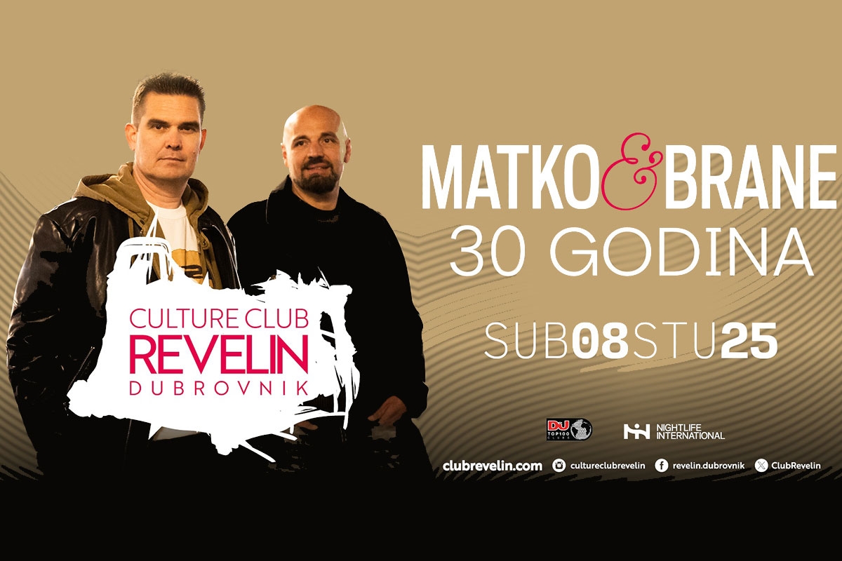 Legendarni duo Matko i Brane po prvi put ikada stižu na pozornicu Culture Club Revelina u Dubrovniku, gdje će u subotu, 8. studenoga 2025., proslaviti 30,5 godina zajedničke glazbene karijere.