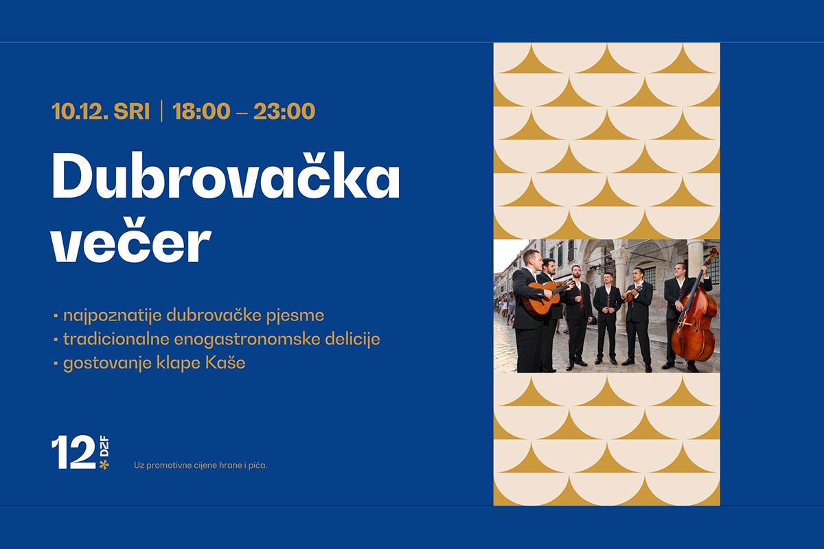 Dubrovački zimski festival poziva sve sugrađane i goste na posebnu Dubrovačku večer koja će se održati u srijedu, 10. prosinca, od 18 do 23 sata na Stradunu. Ova jedinstvena večer tradicije i dubrovačkog kraja donosi glazbeni program posvećen najvećim dubrovačkim umjetnicima. Publika će moći uživati u najpoznatijim hitovima Mila Hrnića, Tereze Kesovije i legendarnih Trubadura, čiji će se hitovi tijekom večeri reproducirati kao glazbeni program, dok će poseban ugođaj upotpuniti nastup Klape Kaše koja će svojim autentičnim zvukom obogatiti blagdansku atmosferu.