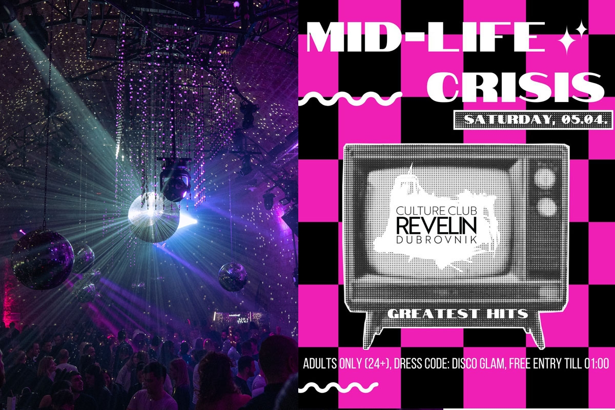 Ove subote. 05.04. klub Revelin ponovno oživljava duh diskoteke te poziva sve na Mid-life Crisis party. Ulaz je dozvoljen isključivo onima koji još uvijek nisu pronašli lijek za krizu srednjih godina (24+)  jer u srcu zabave dolazi Crisis shot o' clock. No ako vas ni to neće natjerati da plešete cijelu noć, pripremite se na najbolje hitove 70-ih i 80-ih a Revelin vam preporučuje da se uskladite s izgledom i dekoracijama kluba te da na zabavi sjajite jače od naše disko kugle.