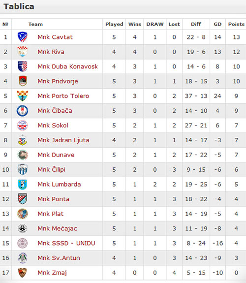 Trenutni poredak: 1. Župa dubrovačka-HE 9 bodova, 2. Vir 9, 3. Imotski 8, 4. Komolac 7, 5. Otok 6, 6. Naklice 6, 7. Hajduk 5, 8. Postranje 3, 9. Gorčina 2, 10. Zlatan Otok 1 bod.