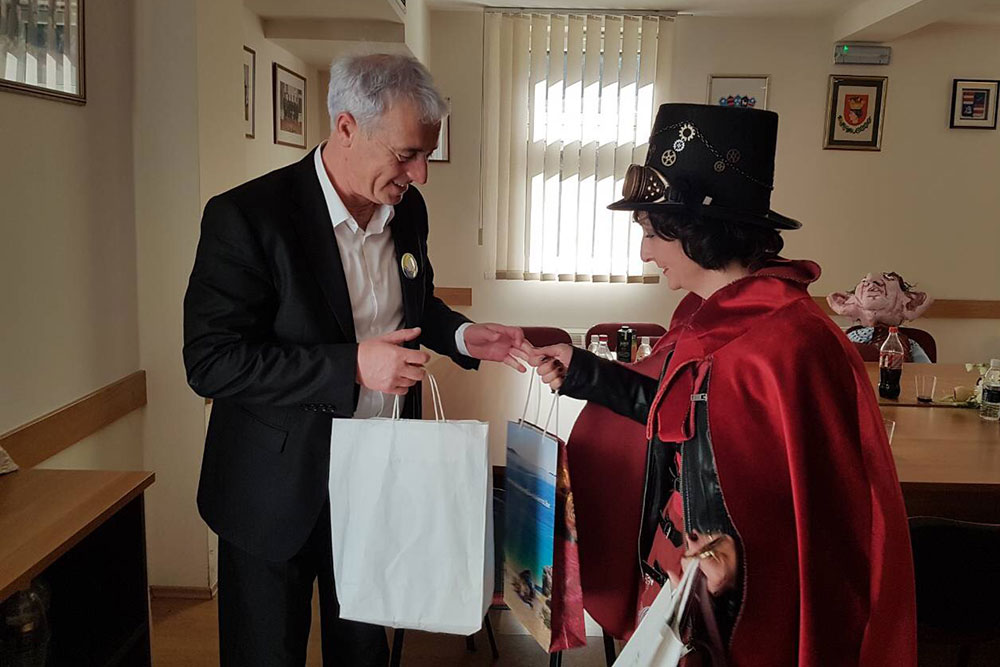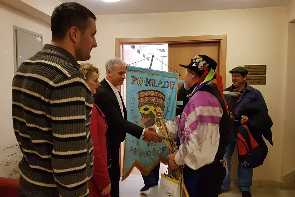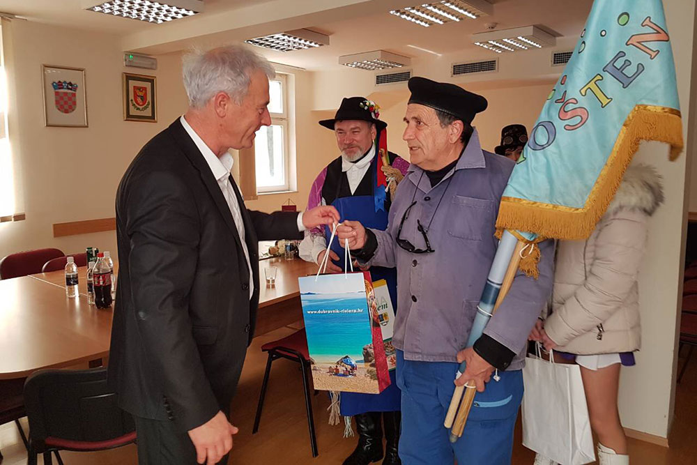 Općinski načelnik je svim sudionicima povorke zaželio ugodan boravak u našem kraju i obilje zabave na karnevalu, te u znak dobrodošlice sa svima izmijenio poklone.