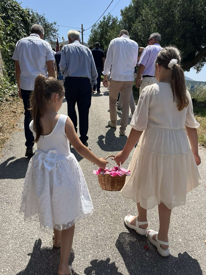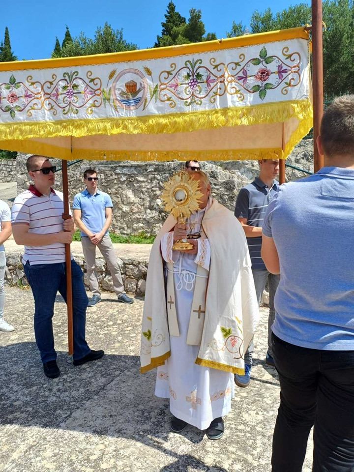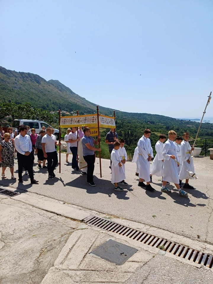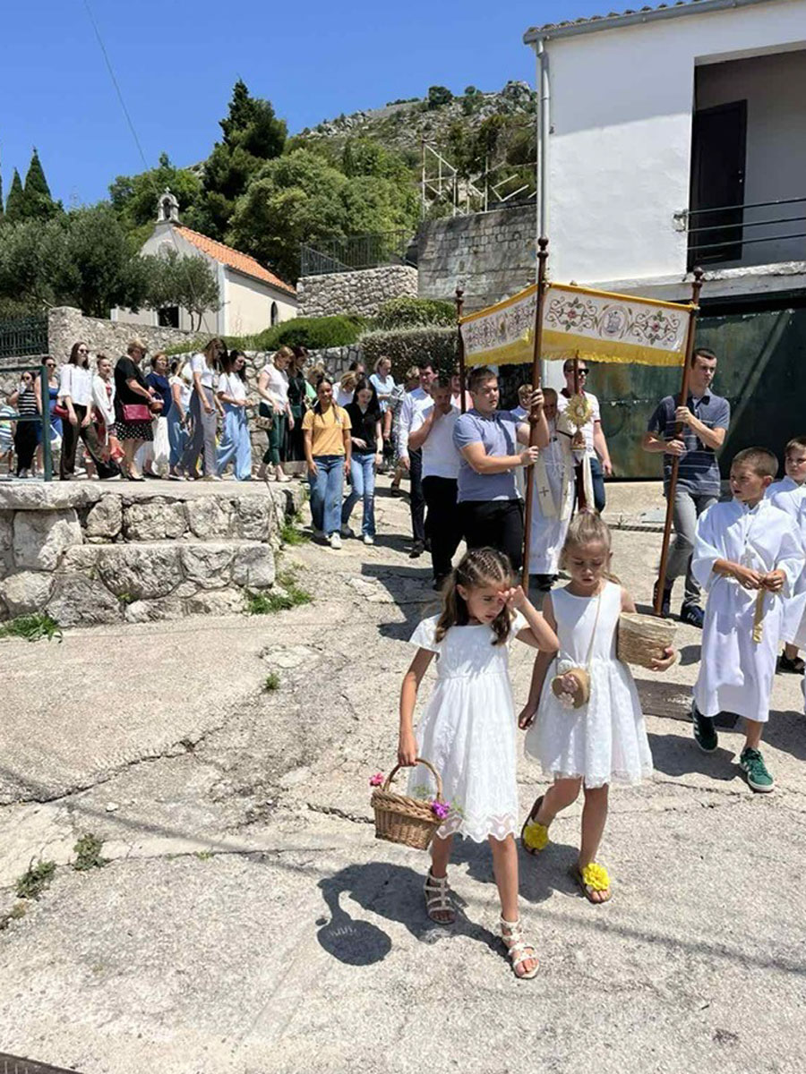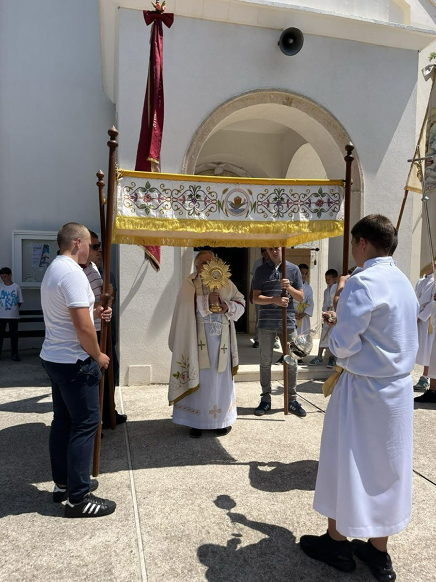 Nakon Sv Mise slijedi procesija kroz mjesto. Na čelu procesije idu baraci koje prate muškarci, a zatim djevojčice koje obasipaju put cvijećem. Muškarci nose baldahin ispod kojega je svećenik koji nosi Presveti oltarski sakramenat. Na samom kraju procesije su žene koje pjevaju i mole. Procesija se zaustavlja na četiri mjesta koja predstavlja četiri strane svijeta te se moli i blagoslovljava. Slijedi povratak u crkvu i blagoslov okupljenih.