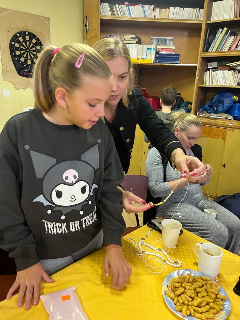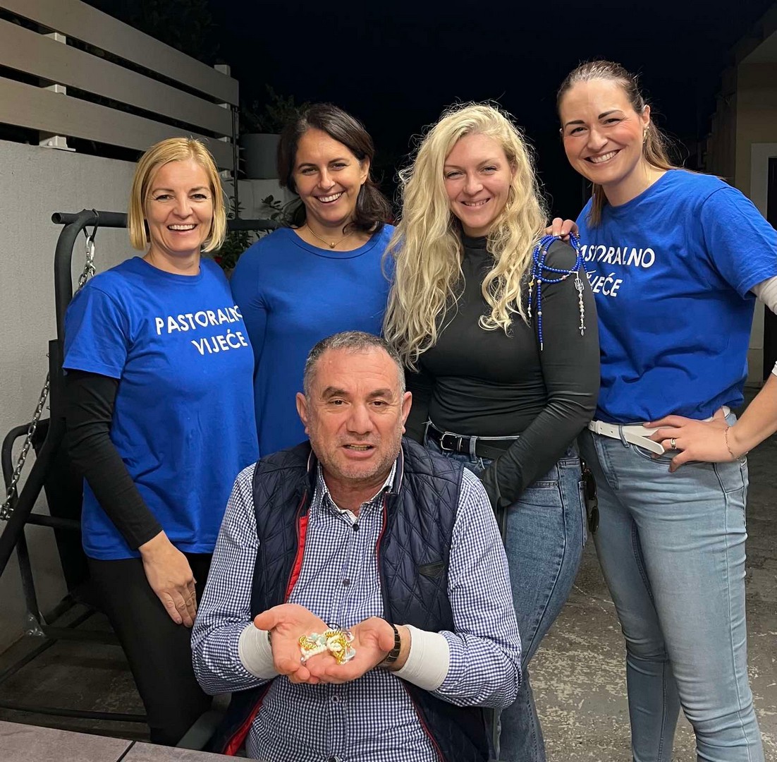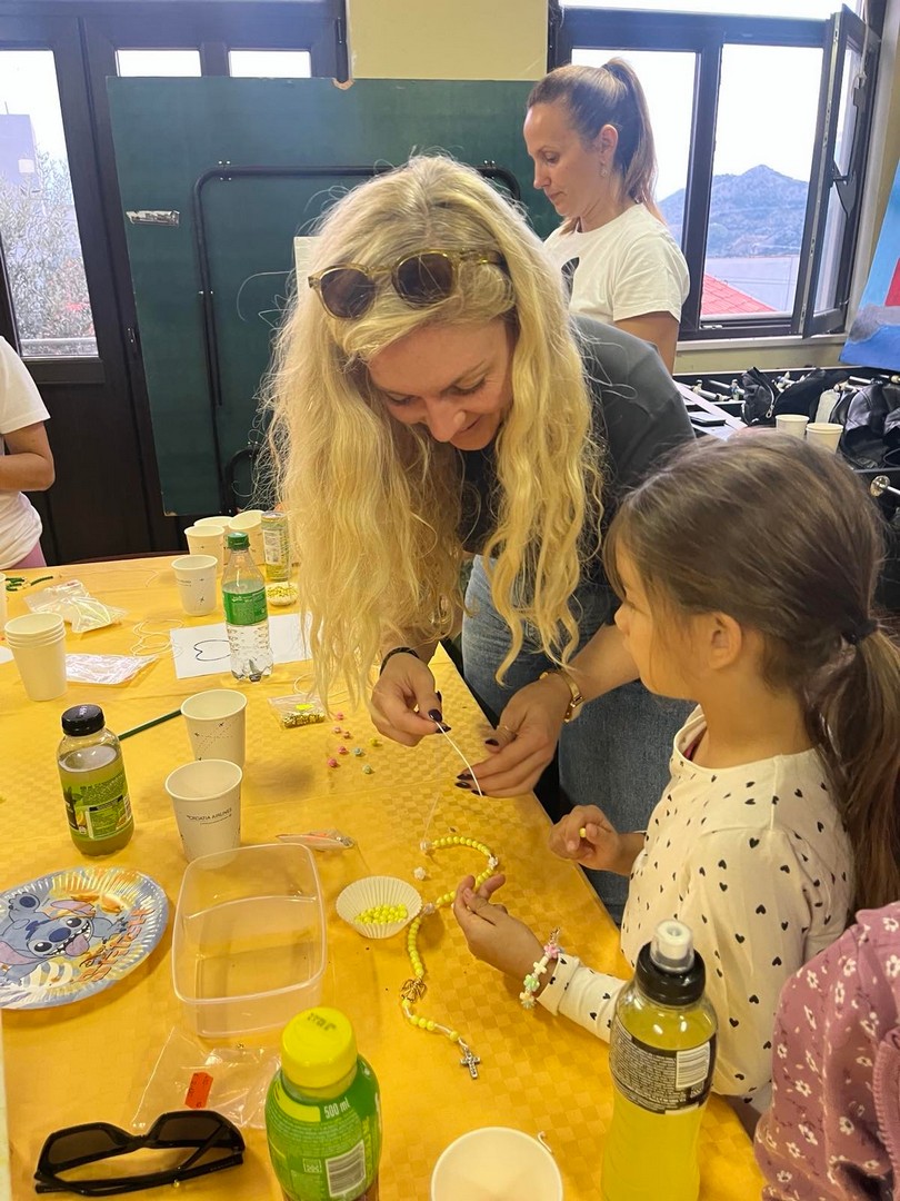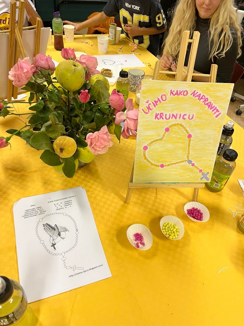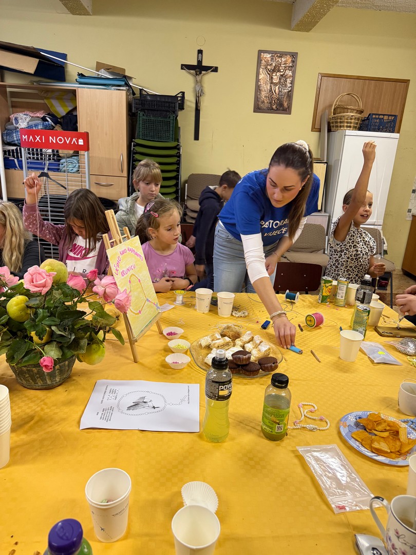 Na radionici su sudjelovali djeca koja se pripremaju za Prvu pričest kao i druga školska djeca. Uz pomoć odraslih djeca su izradila oko 90 krunica koje je župnik u nedjelju 19. listopada blagoslovio. Da druženje bude slađe, mame su donijele kolače, a župnik kavu i sokove.