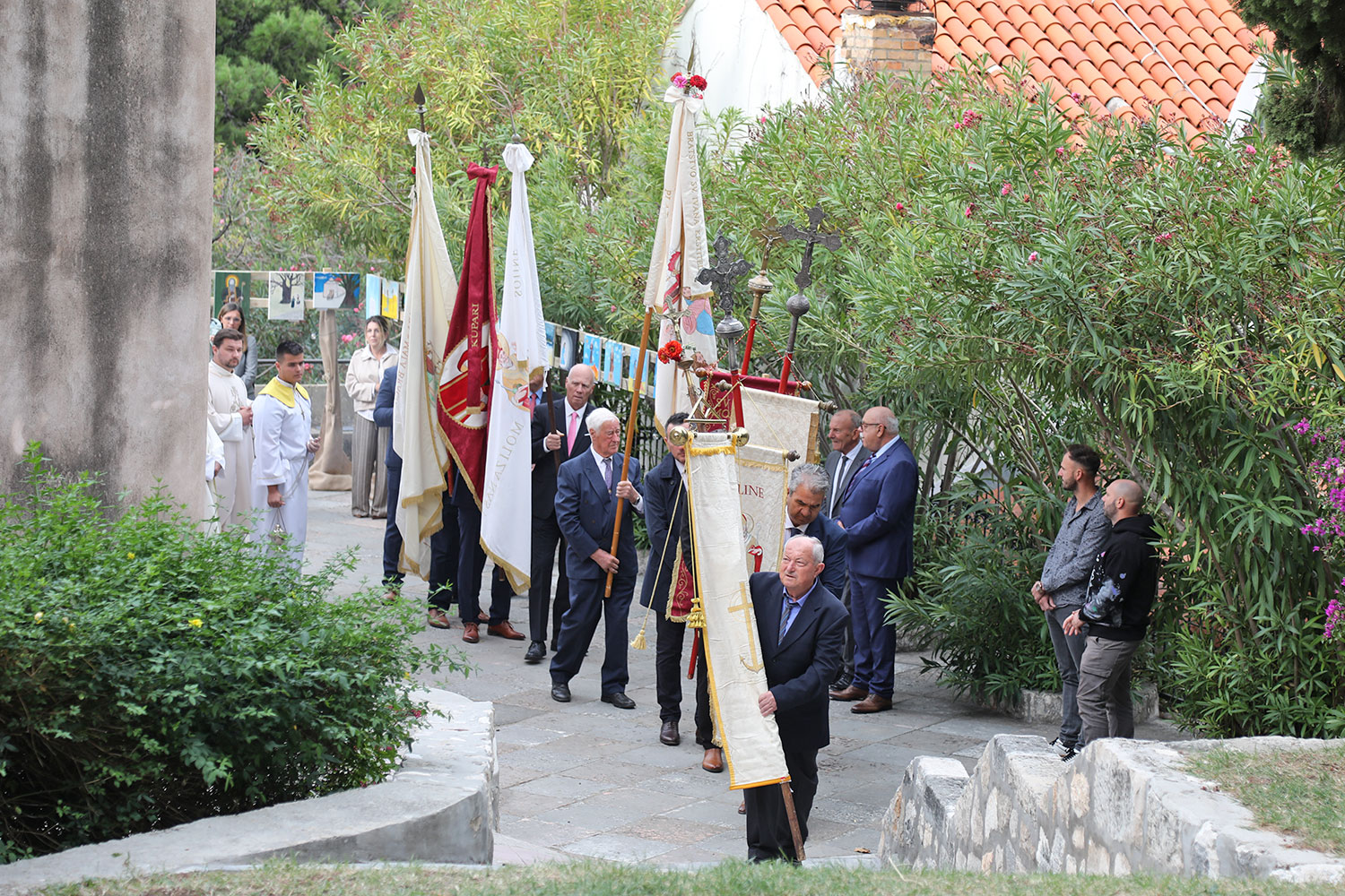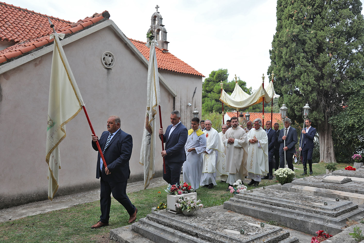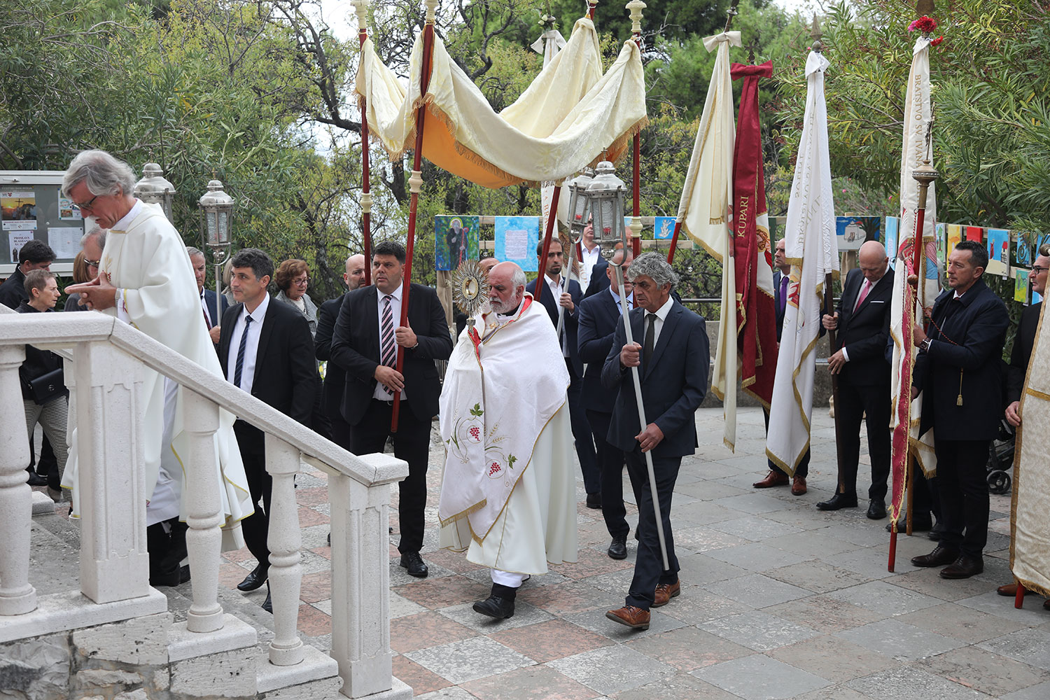 Nakon mise uslijedila je procesija oko crkve u kojoj su nošeni župni barjaci, a pod nebnicom je p. Mandurić nosio Presveti Oltarski Sakrament.