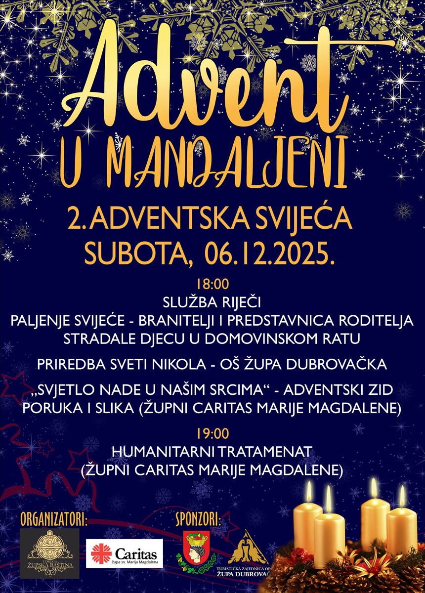Udruga Župska baština, u suradnji sa Župnim Caritasom župe sv. Marije Magdalene, poziva sve mještane i posjetitelje na svečano paljenje druge adventske svijeće koje će se održati u subotu, 6. prosinca 2025., u Mandaljeni, s početkom u 18:00 sati.