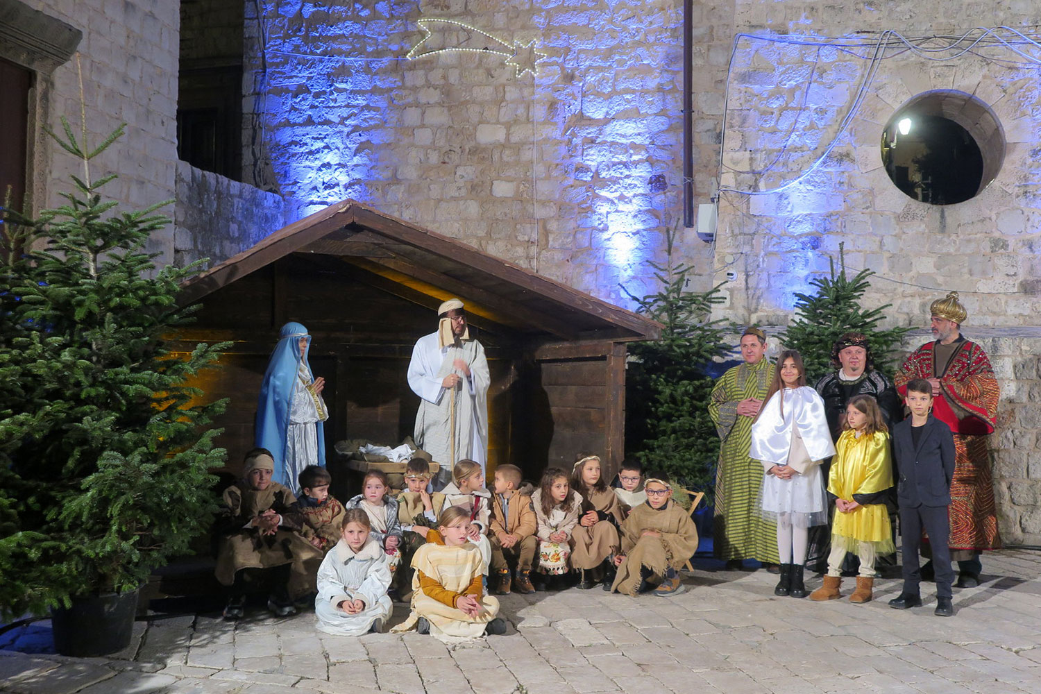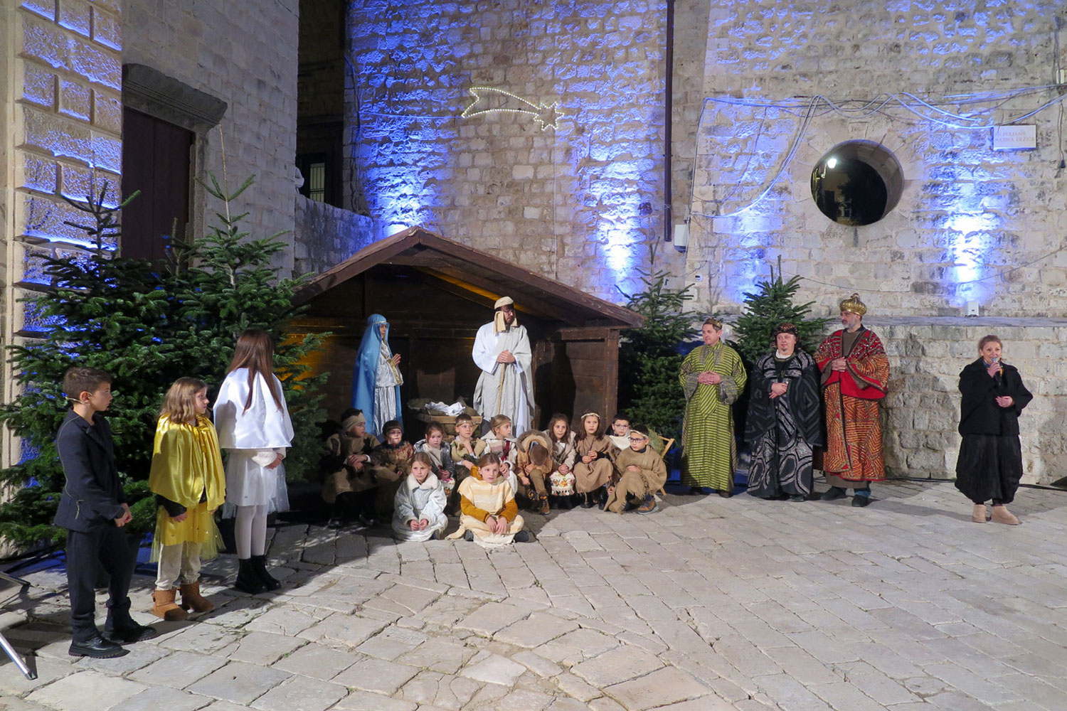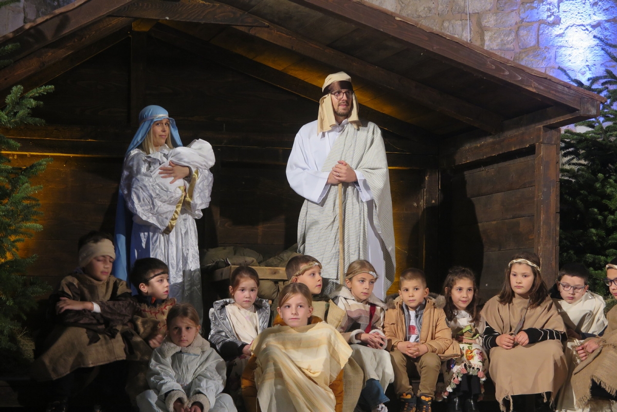 Žive jaslice došla su vidjeti brojna djeca u pratnji roditelja, nona, baka i djedova, a sudionici živih jaslica su zajedno u povorci došli do mjesta izvedbe. Voditeljica programa Nike Nagy kroz vođeni razgovor s djecom je ponovila osnovne podatke o Isusovom rođenju, a potom je troje djece u ulogama zvijezda i mjeseca ispričalo iz svoga kuta što se događalo te svete noći.