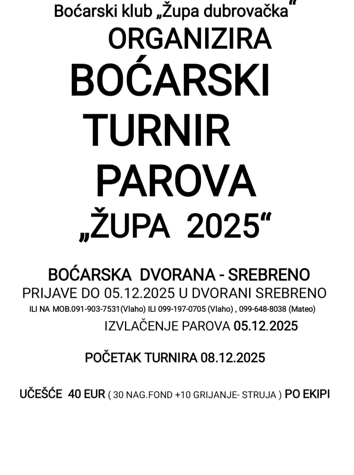U vrijeme Adventa u Župi Boćarski klub Župa dubrovačka organizira "Boćarski turnir parova - Župa 2025." koji će se igrati od 8. prosinca u dvorani u Srebrenom. Prijave se primaju do petka, 5. prosinca u navedenoj dvorani ili na brojeve 091 903 7531 (Vlaho), 099 197 0705 (Vlaho), 099 648 8038 (Mateo).