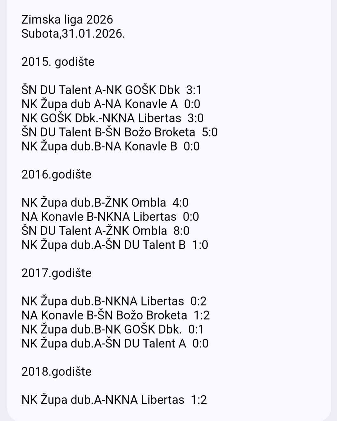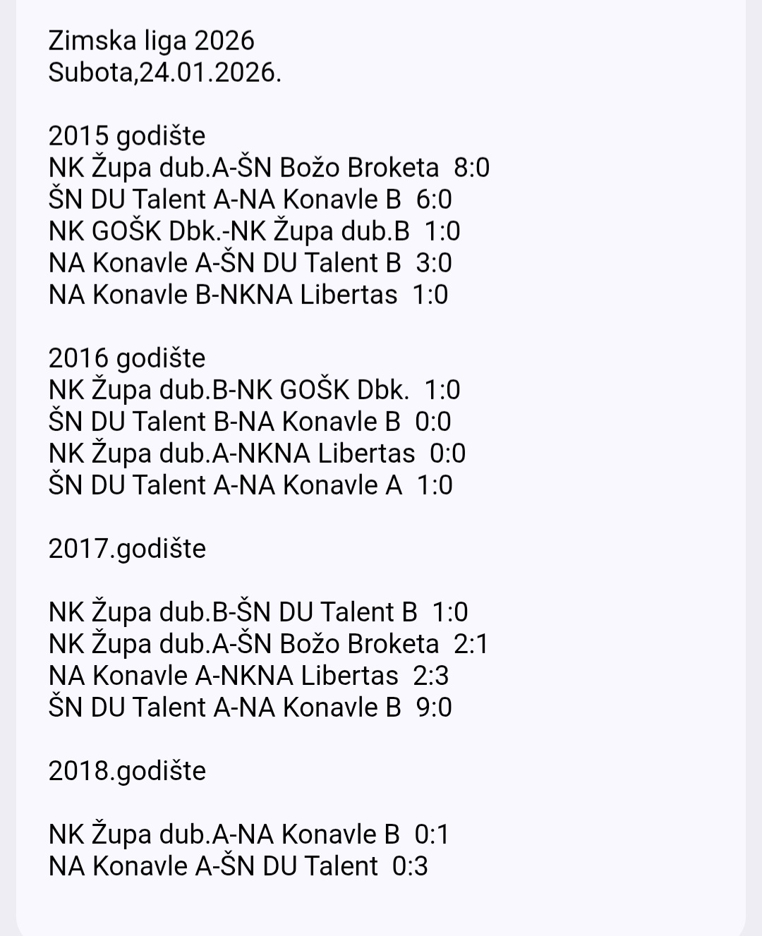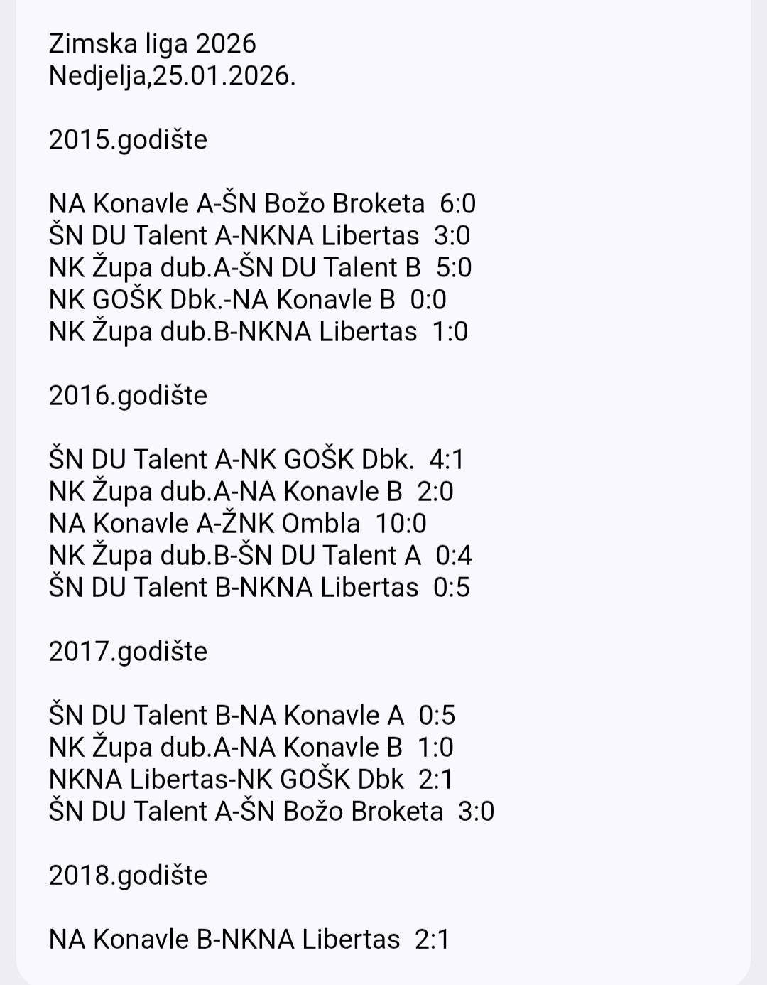 U protekla dva vikenda u dvorani na Mljekari odigrano je natjecanje po skupinama 11. izdanja Zimske lige Nogometnog kluba Župa dubrovačka. U uzrasnim kategorijama 2015., 2016., 2017. i 2018. godište 33 ekipe iz nogometnih klubova i škola nogometa: Konavle, DU Talent, Božo Broketa, GOŠK Dubrovnik, Libertas, Ombla i domaćina Župa dubrovačka.