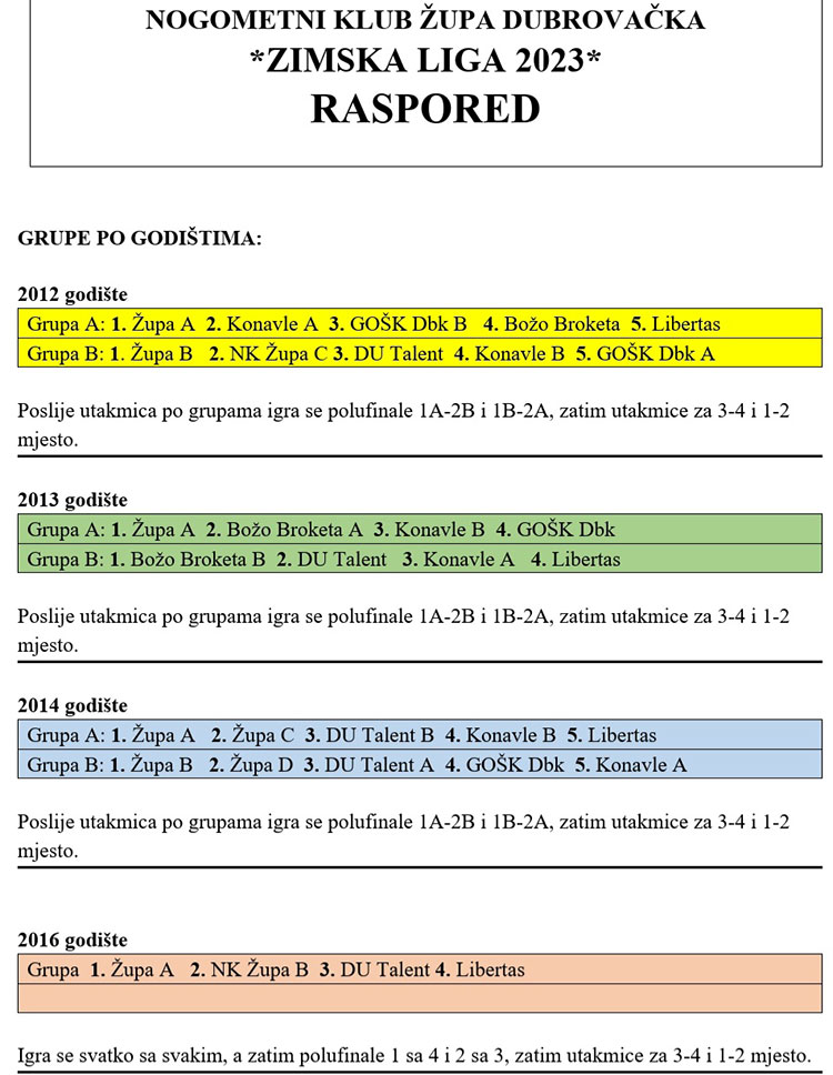 U nedjelju 15.siječnja u dvorani na Mljekari počinje deveto izdanje Zimske lige Nogometnog kluba Župa dubrovačka. Na ovogodišnjoj ligi, šestoj koja se igra u domaćoj dvorani, nastupit će mali nogometaši Župe dubrovačke te nogometnih akademija Libertas i Konavle, Škola nogometa Božo Broketa i DU Talent i GOŠK Dubrovnika 1919. - ukupno 32 ekipe iz ovih šest klubova s oko 350 malih nogometaša.