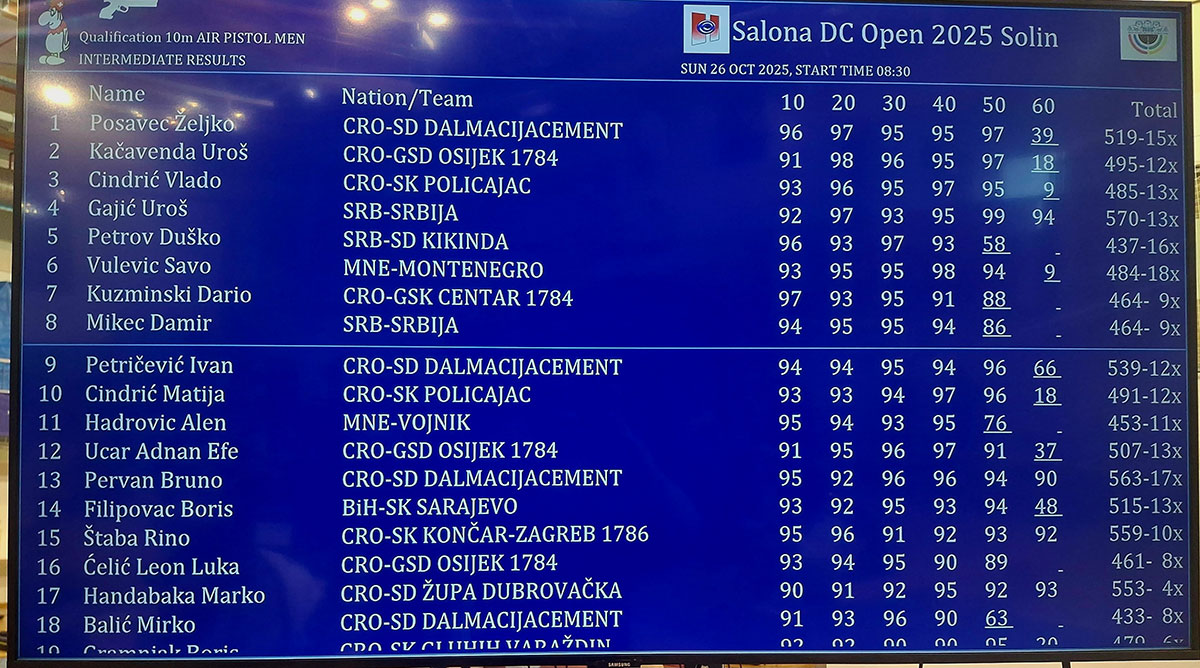 Proteklog vikenda održano je 1. kolo I i II lige Hrvatske i međunarodni turnir Salona Open u Solinu. U natjecanju II Lige Hrvatske u kategoriji zračni pištolj seniori, za streljačko društvo Župa dubrovačka nastupali su Matej Kriste, Marko Handabaka i Antonio Beloč. Strijelci Župe dubrovačke postigli su odlične rezultate. Dva osobna rekorda Matej Kriste 509 krugova i Antonio Beloč 521 krug, još je nastupio i Marko Handabaka s pogođenih 546 krugova. Marko je s ovim rezultatom bio bolji od konkurencije u kadetskom uzrastu. Zvijezda subotnjeg gađanja bio je strijelac Župe dubrovačke Matej Kriste kao najmlađi i najmanji sudionik. Kada na turniru nastupate i natječete se uz Olimpijske, svjetske, europske i državne prvake i odradite kvalitetno gađanje s malo treme, koncentrirano i taktički dobro njegov trener, a i mnogi promatrači, natjecatelji i treneri bili su oduševljen njegovim nastupom.
