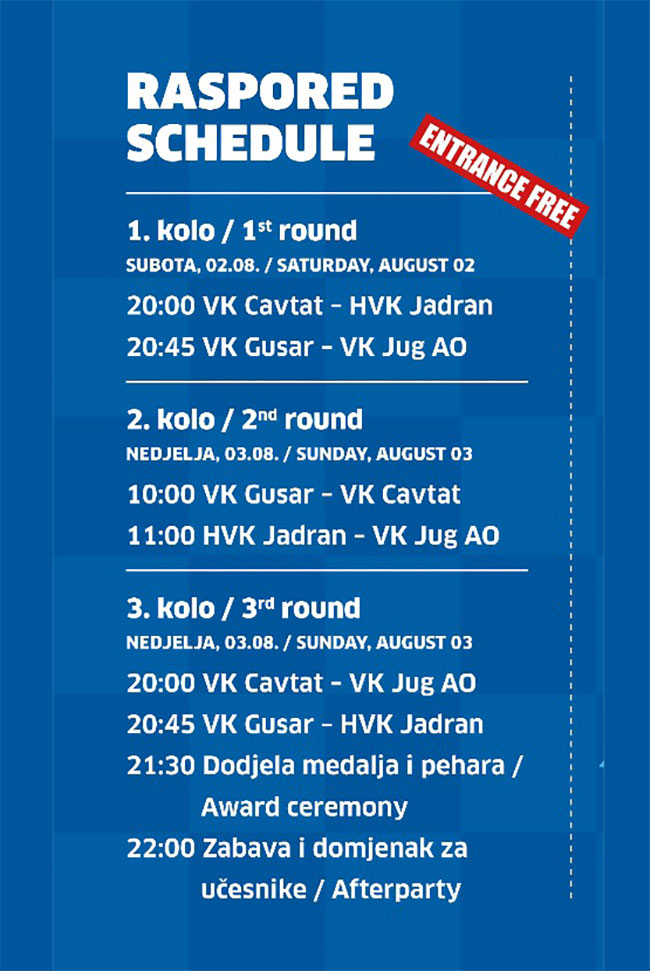 U spomen na prerano preminulog člana Uprave, trenera i dobrog prijatelja – Lovra Vidosavljevića Vučića Gusar i ove godine organizira U12 vaterpolo turnir „LOVRO 2025“ uz sudjelovanje četiri momčadi; VK Gusar, VK Cavtat, VK Jug AO iz Dubrovnika i HVK Jadran iz Neuma. Turnir počinje večeras utakmicama prvog kola, a završava dodjelom nagrada i domjenkom za sudionike u nedjelju oko 21:30 sati.